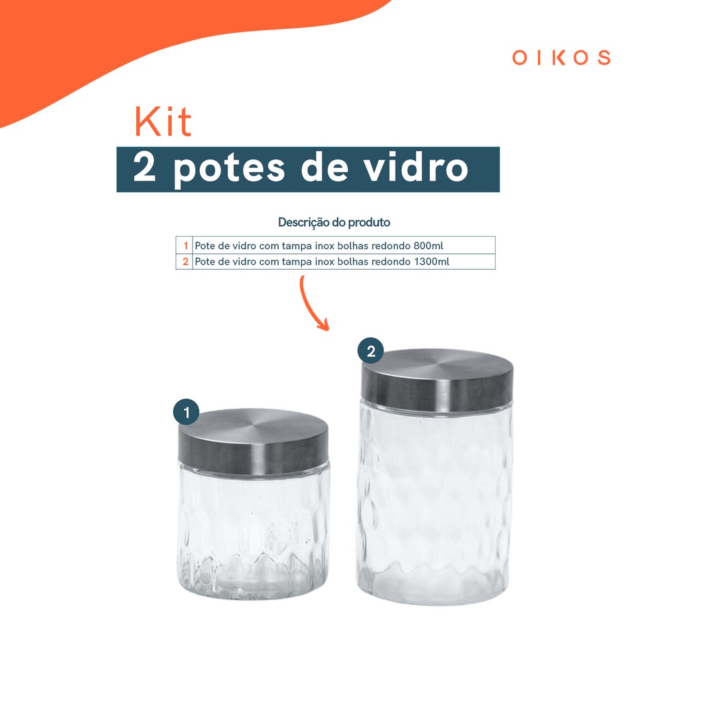 Kit 2 potes de vidro com tampa inox bolhas redondo 800ml e 1300ml - Mozcada