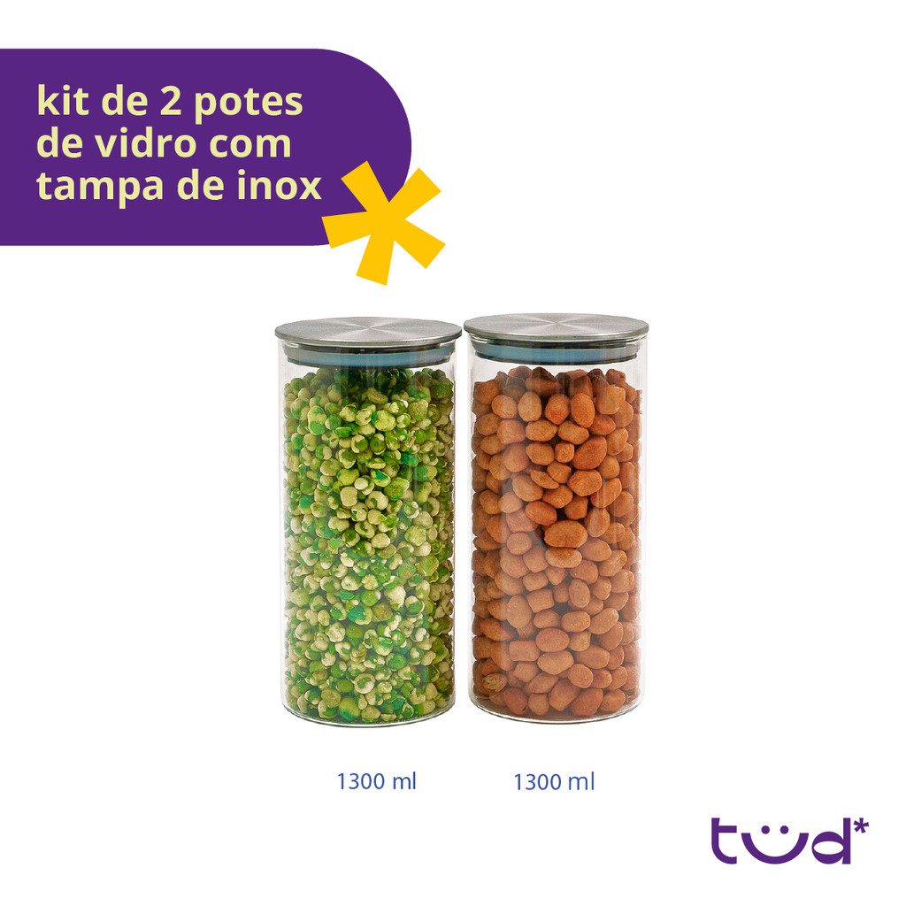 "Oii! Tud bem? Vem saber mais sobre o Kit de 2 potes de vidro com tampa de inox herméticos redondos da Tud! São práticos, seguros e decorativos. São bons demais para armazenar alimentos, itens de escritório e o que precisar! São de vidro borossilicato, material que não retém gosto e nem cheiro após a limpeza. Além disso, o anel de silicone na tampa garante a vedação, conservando o conteúdo por muuuito mais tempo :) O que eles têm de bom: • Vedação hermética; • Tampa de inox; • Vidro borossilicato; • Design moderno. Material: Vidro borossilicato, aço inoxidável e silicone. Para limpar, basta lavar em água corrente com detergente. Cuidados com seus novos potes: Não utilize a área áspera da esponja para limpar. Podem ir na lava-louças sem a tampa. Os potes são Tudbom! Organize sua casa com muuuita praticidade e modernidade. A Tud chegou pra facilitar a sua vida. Somos uma marca brasileira que é tudo de bom! O kit contém: • 2 Potes de vidro 1,3L com tampa inox herméticos Comprimento: 10cm | Largura: 9,5cm | Altura: 20cm O que cabe? 880g de feijão | 760g de farinha de mandioca | 1kg de açúcar"