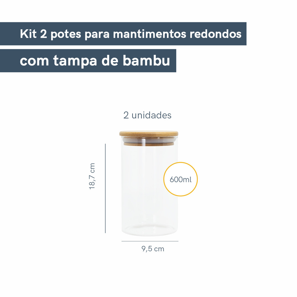 Kit 2 Potes de Vidro Hermético C/ Tampa de Bambu 600ml Oikos