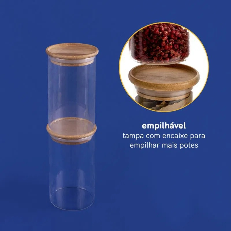Kit 2 Potes De Vidro Para Mantimentos Redondo 600ml Com Tampa Bambu