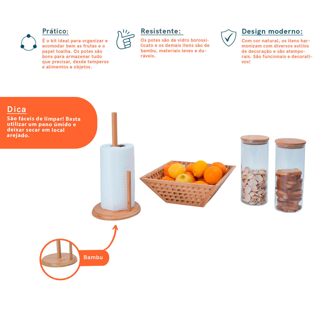 Kit 2 Potes de Vidro Tampa de Bambu 1,6l, Fruteira Vazada Bambu E Porta Papel Toalha de Bambu Oikos