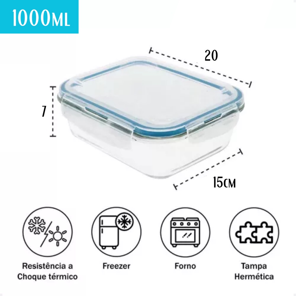 Kit 2 Potes Hermético de Vidro Borossilicato Marmita 1000ml Vasilha Alimentos Retangular
