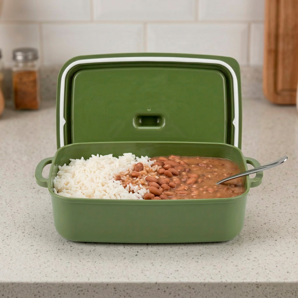O Kit 2 Potes Herméticos Plasútil Marmita Supreme Verde é ideal para armazenar alimentos com praticidade, organização e segurança no dia a dia. Com design moderno em formato de panelinha e pegadores laterais, os potes facilitam o manuseio e são perfeitos para guardar, servir e aquecer alimentos com muito mais comodidade. O conjunto conta com dois tamanhos diferentes, permitindo armazenar desde pequenas porções até refeições completas. As tampas possuem vedação com borracha, que ajuda a conservar melhor os alimentos, evitando a entrada de ar e umidade e mantendo a qualidade por mais tempo. Produzidos em polipropileno (PP), material resistente, atóxico e livre de BPA, os potes são seguros para uso com alimentos. Podem ser utilizados na geladeira e levados ao micro-ondas, trazendo mais praticidade para a rotina da cozinha. Características do Produto: • Marca: Plasútil • Material: Polipropileno (PP) • Livre de BPA e atóxico • Quantidade no kit: 2 potes • Cor: Verde • Formato: Retangular com pegadores laterais • Tampa com vedação de borracha • Indicado para geladeira e micro-ondas Capacidade e Dimensões: Pote 1 – 1,12 L • Comprimento: 14,5 cm • Largura: 22,5 cm • Altura: 8,5 cm Pote 2 – 450 ml • Comprimento: 10,5 cm • Largura: 18 cm • Altura: 6 cm