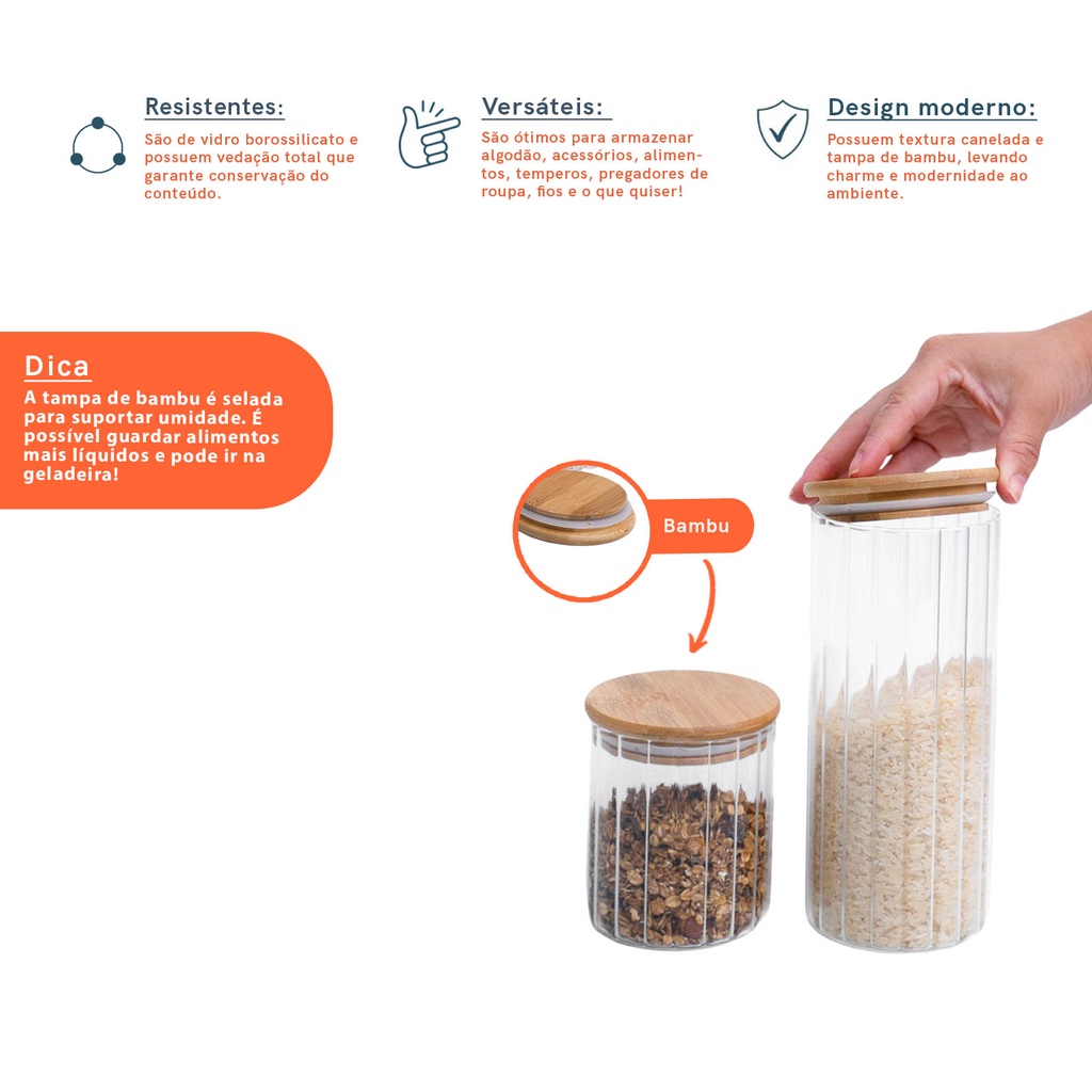 Kit 2 potes vidro herméticos para mantimentos canelado com tampa de bambu - Oikos