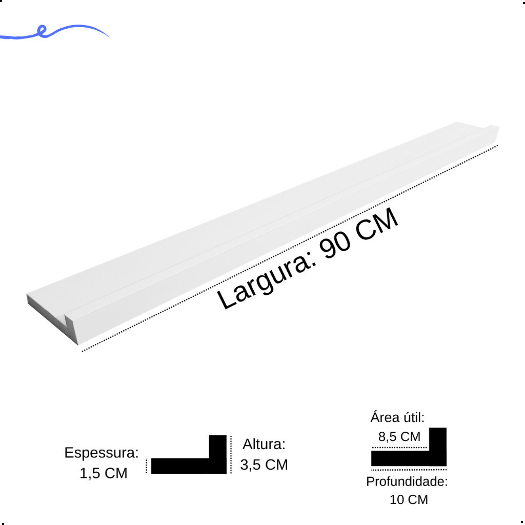 QTD DE PEÇAS: 2 COR: BRANCO TX MATERIAL: 100% MDF DIMENSÕES COMPRIMENTO: 90CM PROFUNDIDADE: 10CM ÁREA ÚTIL (PROFUNDIDADE): 8,5CM ALTURA DA FRENTE: 4,5CM ESPESSURA: 1,5CM (15mm) ATENÇÃO AS MEDIDAS INFORMADAS. ACOMPANHA KIT PARA INSTALAÇÃO.