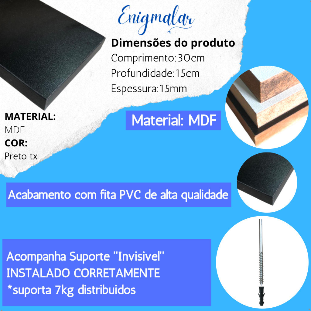 Olá, agradecemos a confiança e Preferência na GTEENIGMALAR. Aproveite para deixar a sua casa mais linda e organizada com nossos produtos. Ideal para ambientes como... Banheiro Sala Quarto Lavanderia Escritorio Lavabo Cozinha Conteúdo do Pacote: - 2 Prateleiras de Mdf Preto tx 30cmx15cm - 4 Suporte Invisível - 4 Buchas Medida 8 Informações técnicas: - Material: MDF - Cor: Preto tx - Espessura do MDF: 15mm (1,5cm) - Comprimento: 30CM - Profundidade: 15CM - Quantidade de peças: 2 GTEENIGMALAR.