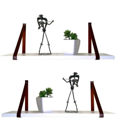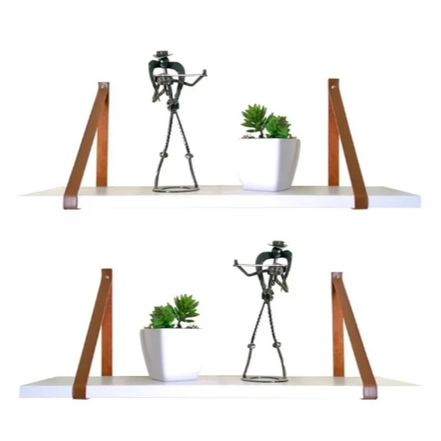 Kit 2 Unidades Prateleiras com Alça de Couro Ecológico 45x15 Prateleira: Medida: 45 cm x 15 cm Material: MDF Laminado Alça em couro legitimo com 2 cm Segue kit fixação incluso ( parafusos, buchas ) Prateleira Suporta: 3 kg Garantia do vendedor: 3 meses