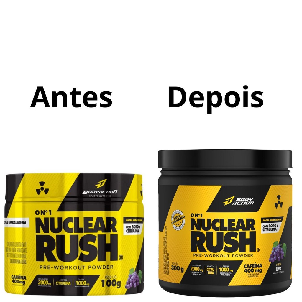 ATENÇÃO: EMBALAGEM NOVA E EMBALAGEM ANTIGA Estamos em processo de transição para a nova embalagem deste produto. Por isso, você poderá receber tanto a embalagem antiga quanto a nova. Independente da embalagem, garantimos que o produto é 100% original e de alta qualidade, direto do fabricante. Se tiver dúvidas, estamos à disposição! Descrição : Kit contém 02 Pré treino Nuclear Rush 100 gramas sabor Uva Eleve sua performance com o Nuclear Rush, o suplemento pré-treino desenvolvido para desenvolvimento tanto o corpo quanto a mente. Com uma fórmula exclusiva que contém cafeína, taurina, beta alanina, coenzima Q10 e vitaminas, este produto foi criado para fornecer o estímulo necessário antes de treinos intensos, ajudando você a superar seus limites. Destaques da Fórmula: Cafeína: Atua como um poderoso estimulante, aumentando a disposição e o foco, para que você entre no treino com energia total. Taurina: Auxilia na redução da fadiga muscular e melhora a resistência, permitindo que você mantenha a intensidade dos exercícios por mais tempo. Beta Alanina: Contribui para a diminuição do acúmulo de ácido lático nos músculos, retardando o início da fadiga e proporcionando um desempenho mais duradouro. Coenzima Q10: Um antioxidante essencial que melhora a produção de energia celular e favorece a recuperação muscular após os treinos. Vitaminas: Com um complexo de vitaminas, a fórmula potencializa o metabolismo energético e o funcionamento do sistema nervoso, garantindo suporte extra para os treinos mais desafiadores. Se você busca evoluir e superar barreiras, o Nuclear Rush é o pré-treino que vai transformar sua rotina de treino. Aproveite agora e leve seus resultados a outro nível!