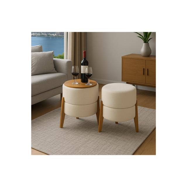 Kit 2 Puffs Mesinha(Original) Bouclé Pés De Madeira Maciça