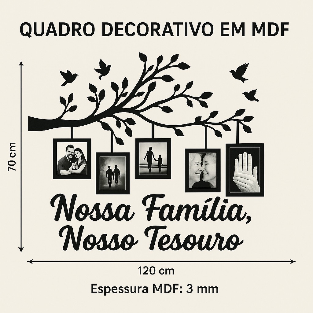 Kit Quadros Decorativos Nossa Família, Nosso Tesouro + Lar Doce Lar 🌟 Amor e aconchego para sua parede Características do produto: ✅ Kit com 2 modelos decorativos complementares ✅ Frases: “Nossa Família, Nosso Tesouro” + “Lar Doce Lar” ✅ Acompanha molduras para fotos (conforme imagem ilustrativa) ✅ Design moderno com árvore, pássaros e acabamento elegante ✅ Ideal para sala, corredor, quarto ou hall de entrada ✅ Material leve e fácil de instalar (adesivo ou parafuso – confirmar modelo) Você vai receber em sua casa: 📦 1 Decoração modelo “Nossa Família, Nosso Tesouro” 70cm X 120cm 📦 1 Decoração modelo “Lar Doce Lar” 35cm X 45cm 📦 Molduras para fotos conforme kit Recomendações de Uso: 👉 Instalar em parede lisa e limpa para melhor fixação 👉 Usar fotos no tamanho compatível com as molduras 👉 Evitar áreas externas ou com umidade 👉 Limpar apenas com pano seco