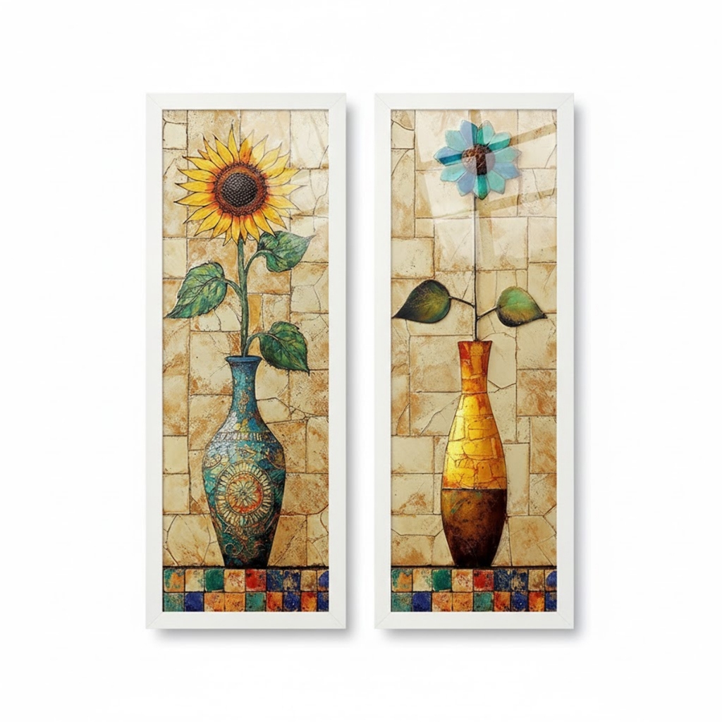 Kit 2 quadros 18x45 cm, sala, banheiro, varanda, girassol, moldura em madeira e vidro