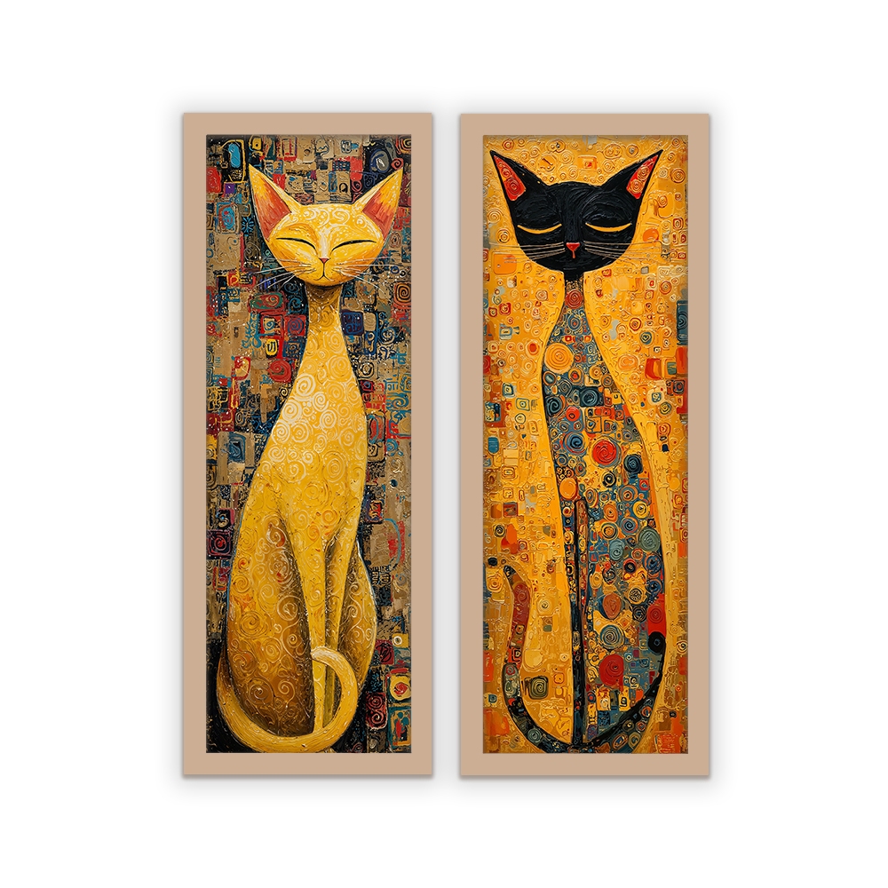 **Dupla Felina Klimt - Ouro e Mistério em Suas Paredes!** Leve para casa o luxo da Arte Nouveau com esta exclusiva dupla de quadros que reinterpreta o estilo **Gustave Klimt** em ilustrações felinas. Um gato preto enigmático e um gato amarelo radiante ganham vida em padrões ornamentais, transformando seus gatos em verdadeiras obras-primas decorativas. **Detalhes técnicos:** - **Tamanho:** 18x45 cm cada (formato vertical elegante) - **Moldura:** Madeira escura com filetes dourados - estilo galeria Vienense - **Vidro:** Proteção museológica anti-reflexo - **Fundo:** MDF texturizado em tom neutro - **Técnica artística:** Releitura digital do estilo Klimt - **Padrões característicos:** Motivos geométricos, ellementos orgânicos Transforma seu espaço em uma galeria particular vienense **Para amantes de arte que também veneram seus mestres felinos!** *Onde a genialidade de Klimt encontra a majestade dos gatos!* **Dica de decoração:** Coloque os quadros em parede com iluminação direta para realçar os detalhes! **Curiosidade:** Os padrões seguem estilos dos trabalhos têxteis que inspiraram Klimt!
