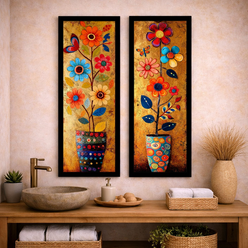 Kit 2 Quadros Decorativos Florais Coloridos Ambiente Moderno e Aconchegante, vasos, flores, pintura