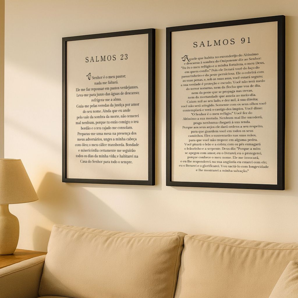 Fé e proteção em dose dupla para abençoar o seu lar. O kit com os quadros Salmos 23 e Salmos 91 é a escolha perfeita para quem deseja decorar com propósito, levar paz aos ambientes e sentir a presença de Deus diariamente. Com design clean, acabamento impecável e mensagens poderosas da Palavra, esse conjunto é ideal para transformar qualquer espaço em um refúgio de fé. >>> Detalhes que fazem a diferença O que acompanha o kit: 2 quadros unitários: Salmos 23 – “O Senhor é o meu pastor” Salmos 91 – “Aquele que habita no esconderijo do Altíssimo” Fabricação Própria Impressão em alta resolução, sem reflexos. Material anti chamas e anti mofo Moldura em madeira pinus 100% natural e laqueada Fundo em madeira Eucatex Material ecológico com selo FSC >>> Disponível em 3 tamanhos: A4 (32x23) A3 (42x30) A2 (60x40) >>> Molduras disponíveis nas cores: preta branca carvalho Não precisa de vidro — a impressão é resistente, não amarela e não desbota Envio rápido no mesmo dia (para compras até meio-dia em dias úteis) - Produto a pronta entrega Ideal para decorar: sala, quarto, cozinha, escritório ou dar de presente com estilo e carinho. Alta durabilidade | Acabamento impecável | Estilo moderno e cheio de vida >>> Leve agora esse kit de fé para sua casa! Clique em comprar agora e receba dois quadros incríveis, com envio rápido, qualidade garantida e mensagens que fortalecem o coração >>> DÚVIDAS FREQUENTES 1. Os quadros são bem embalados? Sim. Os nossos quadros são enviados em embalagens próprias, revestidos com plástico bolha. 2. A moldura é realmente de madeira? Sim! A moldura é de madeira de qualidade, deixando os quadros elegantes e prontos para completar a decoração do seu ambiente. 3. Os quadros têm vidro? Por padrão, nossos quadros não são enviados com vidro. A impressão de alta qualidade dispensa o uso do vidro pelo seu destaque natural. 4. O pedido chega em quanto tempo? Fazemos os envios no mesmo dia (em dias úteis) para compras aprovadas até o meio-dia. Modalidade Flex: entrega no mesmo dia Modalidade Full: entrega em até 24h em capitais Modalidade padrão: varia conforme o CEP 5. Como posso pendurar na parede? Nossos quadros acompanham um pendurador "jacaré" já instalado na moldura que é pendurado na parede por um prego. 6. Posso pendurar com fita dupla face? Sim. Desde que a fita seja de boa qualidade, os quadros podem ser pendurados facilmente. São leves e práticos. 7. Ainda tenho dúvidas, como posso resolver? Sinta-se à vontade para entrar em contato conosco pelo campo de Perguntas. Estamos à disposição para te atender com carinho!