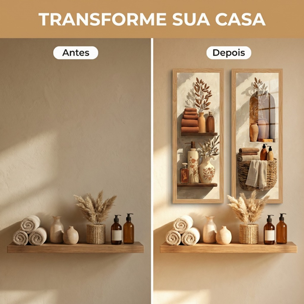BANHEIRO COM ALMA DE SPA EM TONS TERRACOTA Kit de 2 quadros decorativos verticais 18x45 cm com moldura em madeira e vidro protetor. Composições exclusivas em tons terracota quentes e acolhedores, trazendo a atmosfera de um spa boutique pra dentro do seu banheiro. Perfeito pra quem busca quadros decorativos para banheiro, quadros boho ou quadros verticais alongados que transformam ambientes pequenos em refúgios de estilo. O primeiro quadro apresenta uma composição harmoniosa com vasos de plantas, toalhas dobradas e cestos em cores terrosas. O segundo traz um arranjo delicado com frascos rústicos, cremes artesanais e elementos naturais — criando um visual spa que harmoniza com qualquer banheiro moderno. POR QUE ESCOLHER ESTE KIT Quadros verticais 18x45 cm são a solução ideal pra banheiros e lavabos — ocupam pouco espaço horizontal e criam impacto visual na vertical, valorizando pé-direito e aproveitando aquelas paredes estreitas que todo banheiro tem. Dois quadros lado a lado criam uma composição elegante sem pesar no ambiente. O estilo boho terracota é tendência na decoração 2026 — traz aconchego, naturalidade e sofisticação ao mesmo tempo. Combina com decoração boho chic, rústica, mediterrânea, escandinava ou contemporânea. Harmoniza também com diversos ambientes: banheiro, lavabo, corredor, hall de entrada, área de serviço, closet, quarto e até sala de estar ou varanda. DETALHES DO PRODUTO Kit com 2 quadros decorativos no formato vertical 18x45 cm. Design exclusivo e autoral com tema spa boho em paleta terracota. Moldura em madeira de reflorestamento disponível em 3 cores: preto, branco e carvalho. Vidro protetor transparente que realça as cores e facilita a limpeza — essencial pra banheiros, onde a umidade é maior. Fundo em MDF resistente. Impressão em papel fotográfico brilhante premium com alta definição — cada detalhe fica nítido e as cores mantêm a vibração. Presente perfeito pra Dia das Mães, aniversário, casamento, inauguração de casa nova, amigo secreto ou pra presentear quem ama decoração com estilo boho e natural. ESPECIFICAÇÕES TÉCNICAS Marca: Pixer Dimensão: 18 x 45 cm por quadro (vertical alongado) Material da moldura: madeira de reflorestamento Cor da moldura: preto, branco ou carvalho (selecione a variação) Fundo: MDF resistente Proteção: vidro transparente Impressão: papel fotográfico brilhante Tipo de painel: díptico (2 peças verticais) Tema: spa boho com vasos, plantas e elementos naturais Paleta: tons terracota, bege e neutros quentes Estilo: boho chic, rústico, mediterrâneo, contemporâneo, spa Com frases: não DICA DE DECORAÇÃO Disponha os 2 quadros lado a lado (com 3-5 cm entre eles) acima da pia, sobre a bancada ou em qualquer parede estreita do banheiro. Em corredores, instale em sequência vertical pra criar sensação de altura. Combina lindamente com prateleiras decoradas com vasinhos, velas aromáticas e toalhas em tons terrosos. O QUE VEM NO KIT 2 quadros decorativos verticais prontos pra pendurar, com moldura em madeira, vidro e fundo em MDF. Penduradores móveis tipo triângulo já instalados no verso. Obs: pregos, parafusos ou fita dupla-face não acompanham o produto. ENTREGA E GARANTIA Envio rápido com embalagem reforçada em caixa de papelão e plástico bolha individual pra cada quadro. A Pixer oferece garantia contra defeitos de fabricação e trocas rápidas conforme o Código de Defesa do Consumidor.