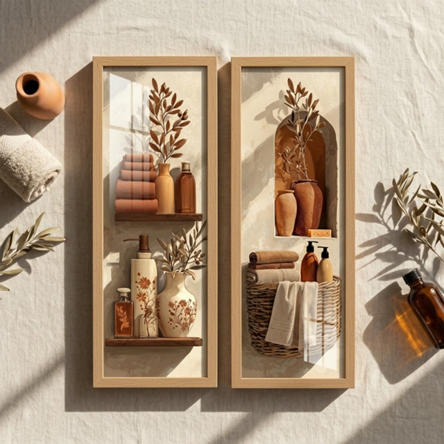 Kit 2 Quadros Decorativos Verticais 18x45 Banheiro Lavabo Boho Terracota Spa Moldura Vidro Presente