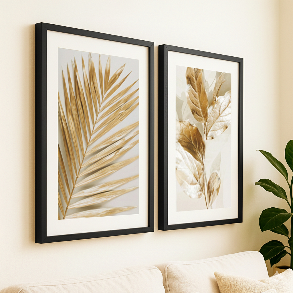 Kit 2 QuadrosDecorativos Moldura 40x60 Folhagem Dourada Grande Luxo Quarto Sala