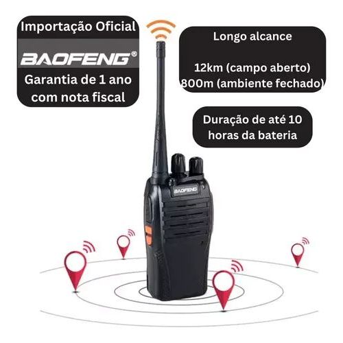 Conheça o incrível Rádio Comunicador Baofeng Profissional, ideal para qualquer sistema de proteção ou equipe de segurança, podendo ser usado em diversas situações como no lazer, no acampamento em família e muito mais, além de ser compacto, moderno e simples de usar, garante comunicação perfeita com o outro aparelho, vale muito a pena. Características: * A qualidade do som e excelente; * 16 Canais; * Tecnologia de redução de ruído; * Possui lanterna; * Alto alcance de 12KM em campo aberto e 800M fechado; * Essencial para qualquer sistema de proteção e segurança. Especificações : Modelo: 777s Saída: 5v Canais: 16 Alimentação: 110V-240V (Bivolt) Alcance de frequência: 400-470MHz. Bateria de Lítio - Capacidade 1.500 Mah Duração da bateria: Aproximadamente 10hrs Alcance: 12KM em campo aberto e 800M em fechado. Espaçamento entre canais: 25Khz Impedância da antena: 50 Potencia de saída RF: 3W Distorção de áudio: 5% Transmissão corrente: 1.3A Tensão operado:3.7V Seletividade: 55dB/50dB Resposta especulativo: 60dB Potencia de saída de áudio: 1000mW Novo padrão brasileiro de tomadas Tempo de carregamento: 4 horas Dimensões: 11,5 x 6 x 3,3 cm Dimensão: 115mm X 60mm X 33mm. Rádio VHF/UHF transceptor FM. Peso:198 g Itens Inclusos : -02 Rádios -02 Baterias -02 Fones de Ouvido -02 Fontes para carregar -02 Clipes de cintura -02 Antenas