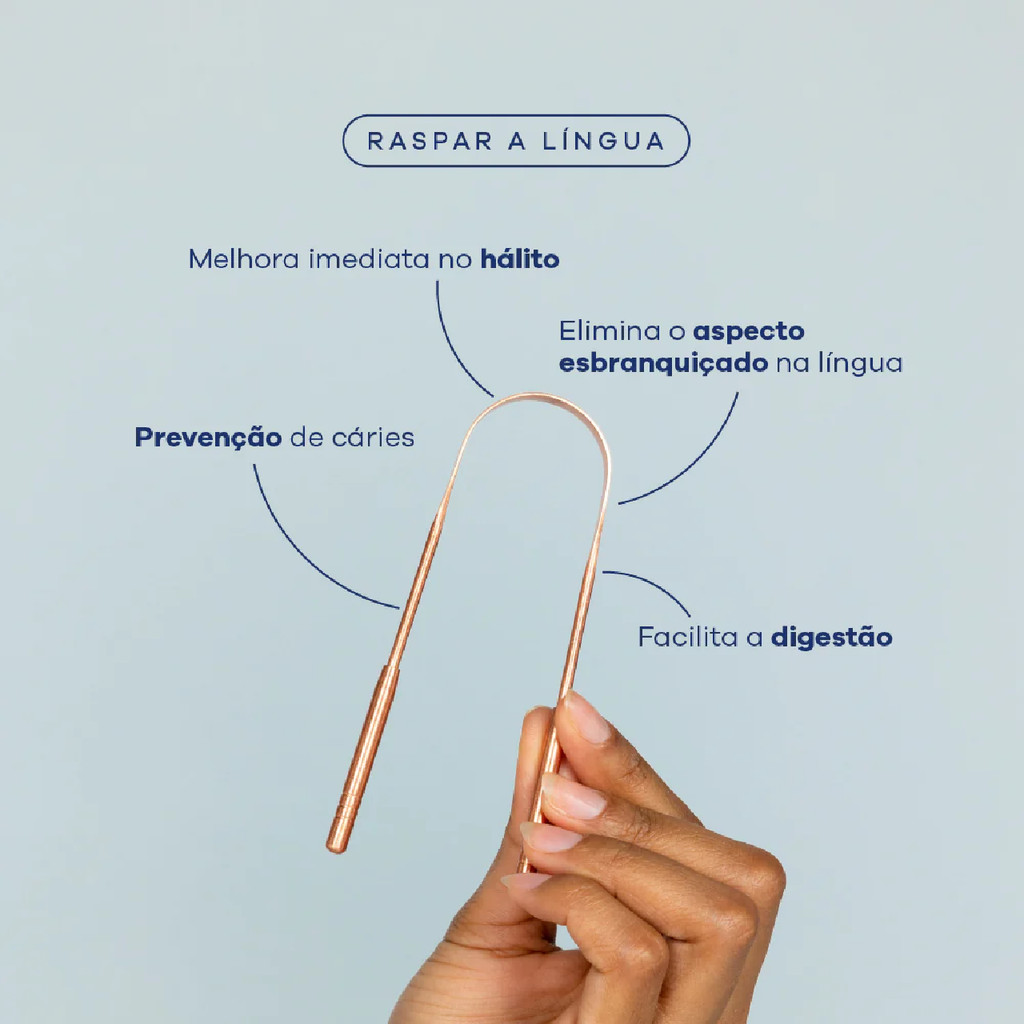 INFORMAÇÕES DE DESTAQUE • Alta Durabilidade • 100% Cobre • Antibacteriano • Uso Adulto DESCRIÇÃO Raspador de língua feito em 100% cobre, material conhecido por sua resistência e propriedades antibacterianas. Projetado para auxiliar na remoção de resíduos da língua, contribuindo para a higiene bucal. MATERIAL • 100% Cobre MODO DE USO • Utilize diariamente pela manhã antes de ingerir líquidos ou alimentos. • Antes do primeiro uso, lave o raspador com água morna. • Posicione a curva maior do raspador na parte posterior da língua. • Puxe suavemente de trás para frente de 5 a 8 vezes. • Enxágue a boca com água e repita se necessário. • Após o uso, lave o raspador com água corrente.
