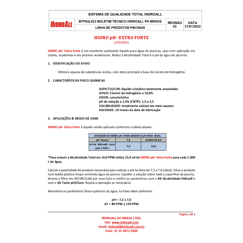 Descrição do Produto Redutor de pH & Alcalinidade HidroAll 1L - Extra Forte Mantenha a qualidade e a clareza da água da sua piscina com o Redutor de pH HidroAll Extra Forte. Este produto é formulado para ajustar rapidamente o pH e a alcalinidade da água, prevenindo a formação de turbidez causada pelo excesso de carbonato de cálcio. Ideal para uso em piscinas residenciais, clubes e academias, o Redutor de pH HidroAll não só clarifica a água, mas também a protege contra as variações que podem afetar o conforto dos banhistas e a eficiência dos outros tratamentos químicos. Principais Funcionalidades Ajuste de pH e Alcalinidade: Reduz eficazmente o pH e a alcalinidade total da água, evitando problemas como água leitosa e irritação da pele e dos olhos. Clarificação da Água: Ajuda a manter a água cristalina, eliminando a turbidez causada pelo excesso de carbonato de cálcio. Uso Versátil: Adequado para piscinas, spas e instalações aquáticas em diversos ambientes como clubes e academias. Como Usar Teste os Parâmetros da Água: Use kits de teste para verificar o pH e a alcalinidade antes da aplicação. Preparação da Solução: Dilua a quantidade necessária do Redutor de pH HidroAll em um balde com água da piscina. Aplicação: Espalhe a solução uniformemente sobre a superfície da piscina. Recirculação: Acione o filtro em modo de recirculação por uma hora para distribuir o produto homogeneamente. Reavaliação e Ajustes: Verifique novamente os parâmetros da água e ajuste se necessário.