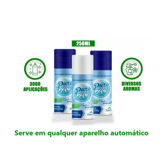 Você receber 2 (dois) refil Neutralizador Odores para Aparelho Automático 250ml com Fragrâncias da sua escolha Odorizador Refil Automático 250ml Puro Ar DomLine O PURO AR foi desenvolvido e formulado com exclusivas fragrâncias para refrescar o seu ambiente, deixando-o perfumado por muito mais tempo. É recomendado o uso em locais como banheiros, quartos, salas e escritórios.