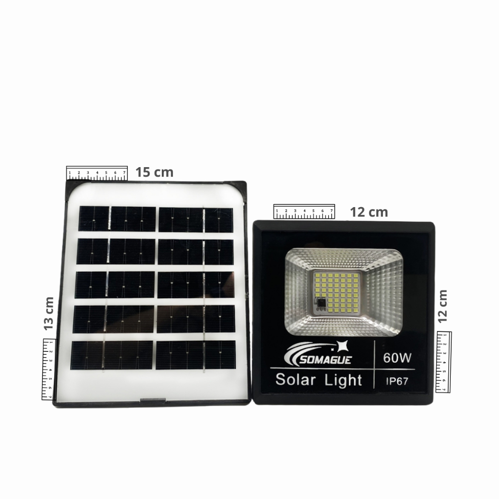 Apresentamos o Refletor Solar 60W é a escolha ideal para quem busca iluminação externa potente, econômica e sustentável. Com placa solar de 16W, ele capta energia durante o dia e garante luz intensa durante toda a noite. Possui LEDs de alta potência, bateria de longa duração e design resistente à chuva e ao sol, proporcionando segurança e praticidade. Fácil de instalar, é ideal para jardins, garagens, entradas, áreas de lazer e estacionamentos. Dimensões: - Placa Solar: 15 cm x 13 cm – 16W - Refletor: 12 cm x 12 cm – 60W O que vem incluso: - 02 Refletor Solar 60W - 02 Placa Solar 16W - 02 Controle remoto - Suporte do Painel + Parafuso de Expansão