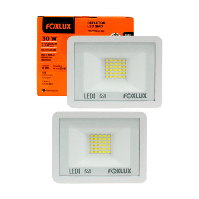 proporciona iluminação intensa e uniforme, ideal para residências, escritórios, garagens e áreas de circulação que exigem clareza e segurança. A luz branca fria de 6500K favorece a visibilidade e proporciona ambiente mais produtivo e confortável. Seu corpo branco e design compacto permitem integração discreta em diferentes estilos de instalação. Com tecnologia LED, assegura economia de energia e longa durabilidade, reduzindo custos com manutenção. **Ficha Técnica:** – Potência: 30W – Tensão nominal: Bivolt – Tipo de lâmpada: LED – Cor da luz: 6500K (branca fria) – Fluxo luminoso: 2700 lm – Cor do corpo: Branco – Tipo de instalação: Externa ou interna, em parede ou superfície adequada – Grau de proteção: IP65 (resistente à água e poeira) - quantidade: 2 unidades **Como Utilizar:** Fixe o refletor em superfície firme utilizando suportes ou parafusos adequados. Conecte os fios à rede elétrica bivolt com a energia desligada, garantindo segurança durante a instalação. Após a fixação, religue o disjuntor para acionar o equipamento. Evite submersão em água e não direcione a luz diretamente aos olhos. **Diferenciais:** – Corpo branco que se adapta bem a ambientes residenciais e comerciais. – Luz branca fria de 6500K que favorece foco e produtividade em escritórios. – Instalação prática em áreas internas e externas. – Proteção IP65 que assegura resistência contra poeira e jatos de água. – Tecnologia LED que oferece economia significativa de energia e menor necessidade de manutenção. **Perguntas Frequentes (FAQ):** P: Esse refletor pode ser usado em áreas externas descobertas? R: Sim, possui proteção IP65, adequado para uso externo. P: Ele é compatível com redes de 127V e 220V? R: Sim, é bivolt automático. P: Qual a cor da luz emitida? R: Luz branca fria de 6500K. P: É indicado para iluminação de escritórios? R: Sim, proporciona iluminação clara que auxilia na produtividade. P: Precisa de manutenção frequente? R: Apenas limpeza externa ocasional, sem necessidade de troca de lâmpadas. **Sobre a Marca:** Há mais de 20 anos, a Foxlux fornece produtos para a construção e manutenção de ambientes residenciais e de trabalho. Presente em todo o Brasil, a marca atua nos segmentos de Iluminação, Ferramentas, Materiais Elétricos e Utilidades, oferecendo um amplo e completo portfólio de produtos reconhecidos no mercado pela segurança e qualidade.