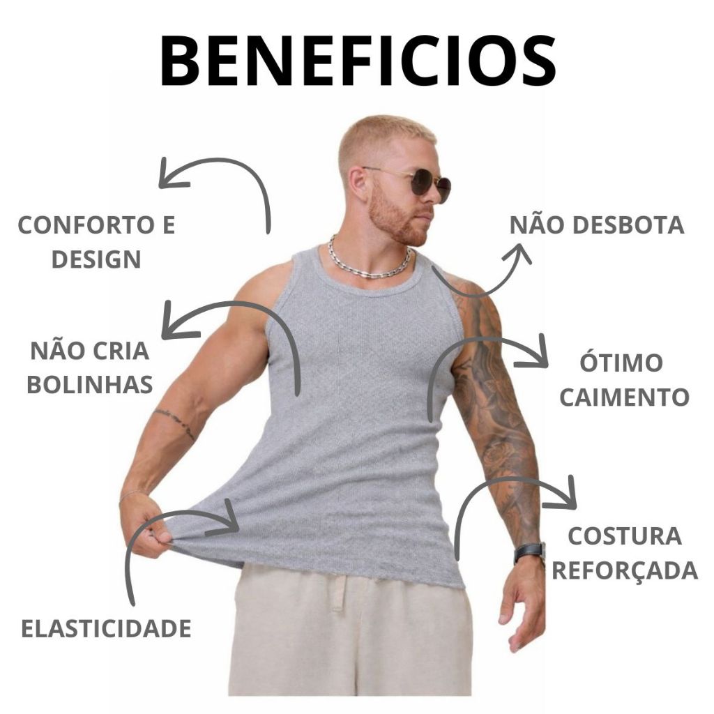 Bem Vindo A Protec PB! Regata Estilo AMERICANA - TRADICIONAL (mais fechada nas costas) Malha Ribana Canelada: tecido encorpado e resistente Nossas regatas e camisetas são confeccionadas em Malha de ALGODÃO com ELASTANO Premium, o q confere muita versatilidade ao aderir perfeitamente ao corpo, sem marcar! Diferenciais da nossa Regata: Modelo Slim que ajusta ao corpo Não cria bolinhas Nossa costura é reforçada Peça com ótima elasticidade Acabamento impecável Não desbota Resistente a inúmeras lavagens Alta durabilidade Não marca quando vestida Ideal Para academias, para o dia-a-dia, bem como, para baladas . Tudo questão de gosto! Um item básico que não pesa no bolso e faz toda a diferença. Tecido encorpado, que se ajusta perfeitamente ao corpo, conferindo conforto e beleza, por ser feita em algodão com elastano, não dá bolinha. Seguindo todas as instruções de lavagem afixadas na peça, sua durabilidade será muito grande. 💡Recomendações de Tamanho: P 50 até 65 kg M 65 a 75 kg G 75 a 85 Kg GG acima de 85 kg