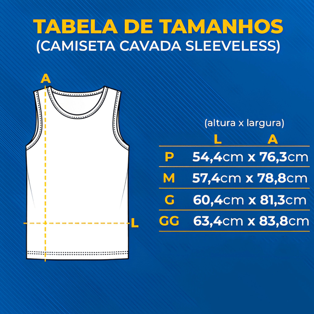Regata Oversized Sleeveless Premium para Academia Com um design amplo e confortável, essa regata é confeccionada com materiais de alta qualidade, garantindo resistência e estilo. Seu caimento solto proporciona um visual moderno e descontraído, enquanto o tecido macio garante conforto prolongado. Disponível em várias estampas, é a escolha ideal para compor looks casuais, urbanos ou streetwear. Características do Produto: - Modelo: Regata Premium Básica com Gola Redonda - Tamanhos Disponíveis: P, M, G e GG - Estampa: Impressão DTF - Detalhes da Estampa: Acabamento com textura levemente emborrachada, similar ao silkscreen, oferecendo alta resistência e durabilidade mesmo após diversas lavagens. - Tabela de Medidas (Largura x Comprimento): P: 54,4 cm x 71,3 cm M: 57,4 cm x 72,5 cm G: 60,4 cm x 75,3 cm GG: 63,4 cm x 77,5 cm Como Escolher o Tamanho Ideal: - Confira a tabela de medidas disponível nesta descrição ou na seção de tamanhos. Para garantir que o tamanho seja perfeito, compare as medidas da regata com uma peça de roupa que você já possui e veste bem. Esse método simples ajuda a evitar erros na escolha do tamanho. Instruções de Cuidados: - Lave a peça com a estampa virada para o avesso. - Evite alvejantes, água quente ou ciclos pesados na máquina de lavar. - Estenda à sombra para secar e evite torcer excessivamente. - Não passe ferro diretamente sobre a estampa. Ao passar, mantenha a peça pelo avesso e prefira uma superfície adequada como uma tábua de passar. - Essa regata combina estilo e funcionalidade, tornando-se indispensável para o dia a dia ou momentos de treino.