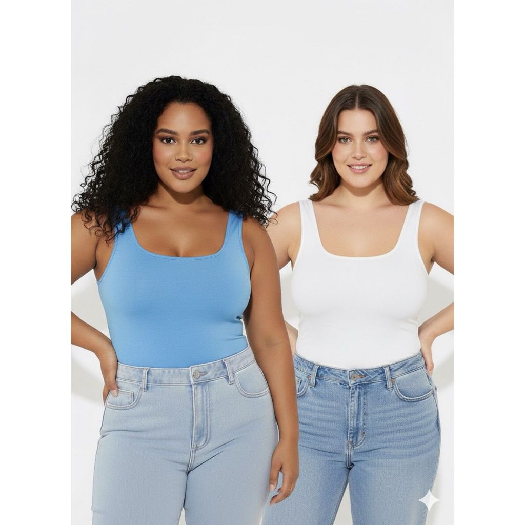 kit 2 Regatas Tecido suplex Alça larga Tamanhos e Medidas: GG-44-46= Busto: 114 cm / Comprimento: 60 cm G1-48-50= Busto: 120 cm / Comprimento: 62 cm G2-52= Busto:126 cm / Comprimento: 64 cm G3-54= Busto:132 cm / Comprimento: 66 cm
