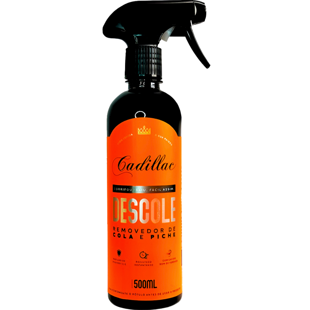 KIT CONTÉM: 2- DESCOLE CADILLAC 500ml 1-ESPONJA AZUL REMOVEDOR DE COLA E PICHE FACIL APLICAÇÃO CADILLAC: O Descole da Cadillac é um removedor de alto desempenho formulado com óleo de laranja, especialmente desenvolvido para lidar com os resíduos mais difíceis do dia a dia. Ele elimina com facilidade piche, adesivos, graxas, colas, manchas de óleo e sujeiras impregnadas em superfícies automotivas, como lataria, vidros, plásticos e metais. Sua ação poderosa penetra profundamente nos resíduos e os dissolve rapidamente, sem agredir a superfície.