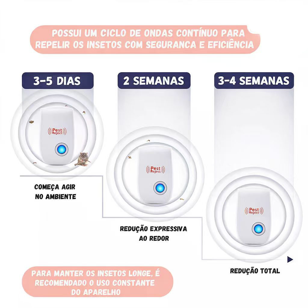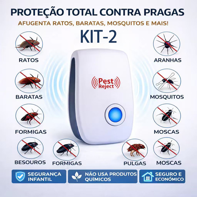 Repelente Eletrônico Ultrassônico – Proteção Eficiente Contra Pragas Mantenha sua casa livre de insetos e pragas de forma prática e segura! O repelente ultrassônico emite ondas de alta frequência que ajudam a afastar mosquitos, baratas, ratos e outros invasores, sem cheiro e sem produtos químicos. ⭐ Principais Vantagens Seguro e confiável: Sem odor, sem veneno, sem produtos químicos e silencioso. Alta eficiência: Cobertura aproximada de 20 a 30m² por aparelho. Fácil de usar: Basta conectar na tomada e deixar funcionando. Design compacto: Pequeno, discreto e ideal para qualquer ambiente. Baixo consumo de energia: Potência de 5–6W, econômico no dia a dia. Frequência ultrassônica 20–50kHz: Ajuda a manter as pragas afastadas. Uso versátil: Recomendado para quartos, sala, cozinha, escritório e depósitos. Especificações Técnicas Cor: Branco Material: ABS Peso: 47g Alimentação: AC 90V–250V / 50–60Hz (Bivolt) Potência: 5–6W Frequência: 20–50kHz Tamanho: 85 × 50 × 55mm ️ Como Usar Conecte o aparelho diretamente na tomada. Instale a uma altura de 80 a 120cm do chão. Evite colocar atrás de móveis grandes ou cortinas (pode bloquear as ondas). Para melhores resultados, use 1 unidade por cômodo. ⏳ Resultados Progressivos 1ª semana: pragas começam a ficar agitadas e sair dos esconderijos. 2ª–3ª semana: redução significativa da presença de insetos. 4ª semana: ambiente muito mais limpo e livre de pragas. Segurança para Pets O aparelho é seguro para cães, gatos e pássaros. ️ Recomenda-se evitar uso muito próximo de roedores de estimação (hamsters, porquinhos-da-índia etc.). ️ Compromisso Ambiental Produto não tóxico e ecológico, sem venenos e sem contaminação do ambiente.