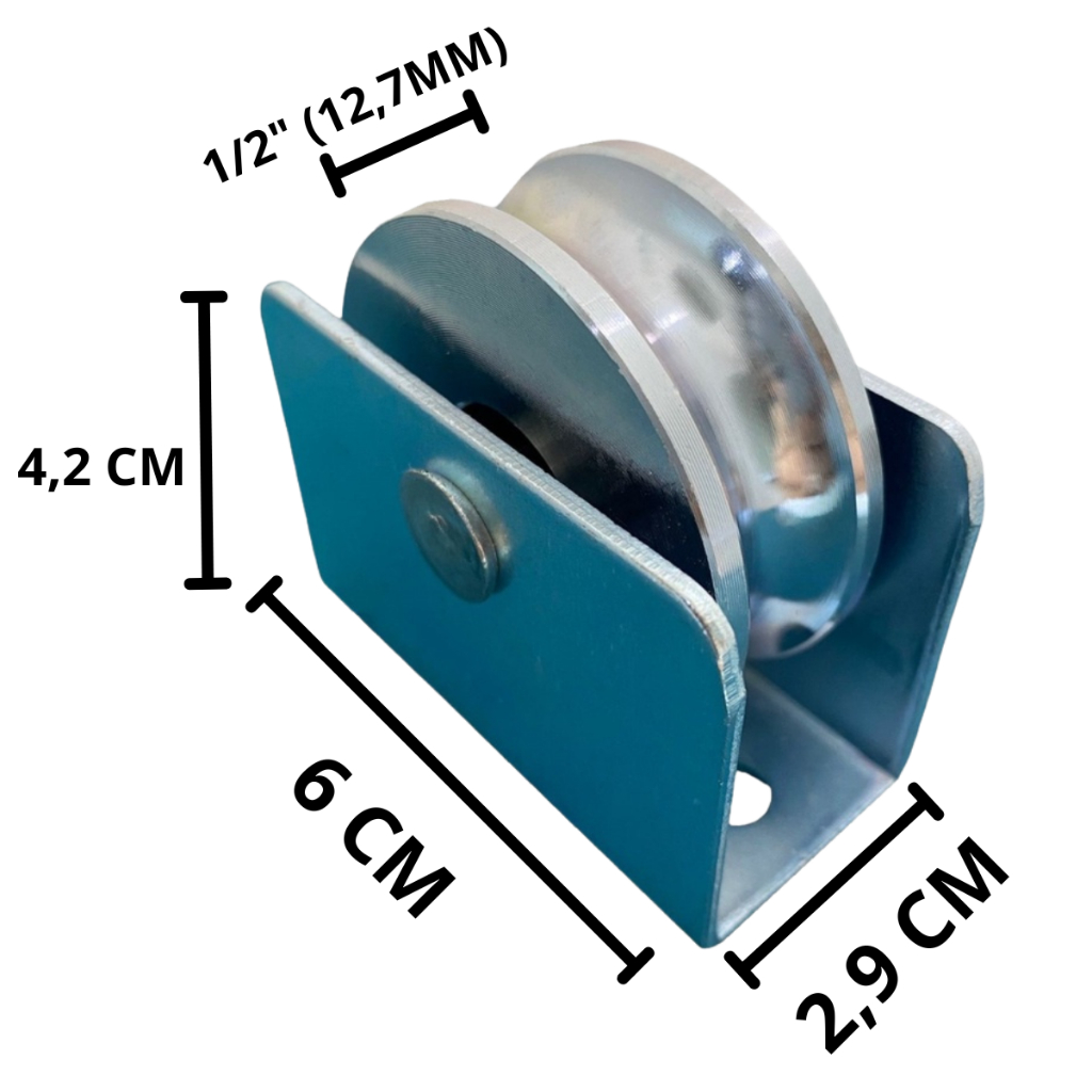 Descrição produto Medidas Altura Roldana: 2 Polegadas (5 CM/ 50MM) Dimensões da caixa = comprimento 6 cm x 4,2 cm altura x 2,9 cm largura Largura Do Canal: 12,7 MM • Roldana com caixa para facilitar instalação • Canal mecânico • Produzido em aço • Oferece zinco, não enferrujando • Rolamento interno lubrificado • Roldana com blindagem de rolamento, assim não entra resíduos no rolamento, oferecendo maior durabilidade do produto Para correr em tubo de 1/2 mecânico (12,6mm)
