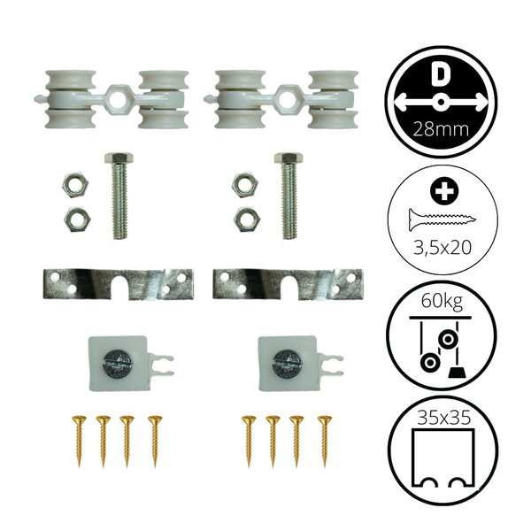 Kit 2 Roldanas e 1 Guia para Trilho Alumínio 35x35 - Branco - Alfer