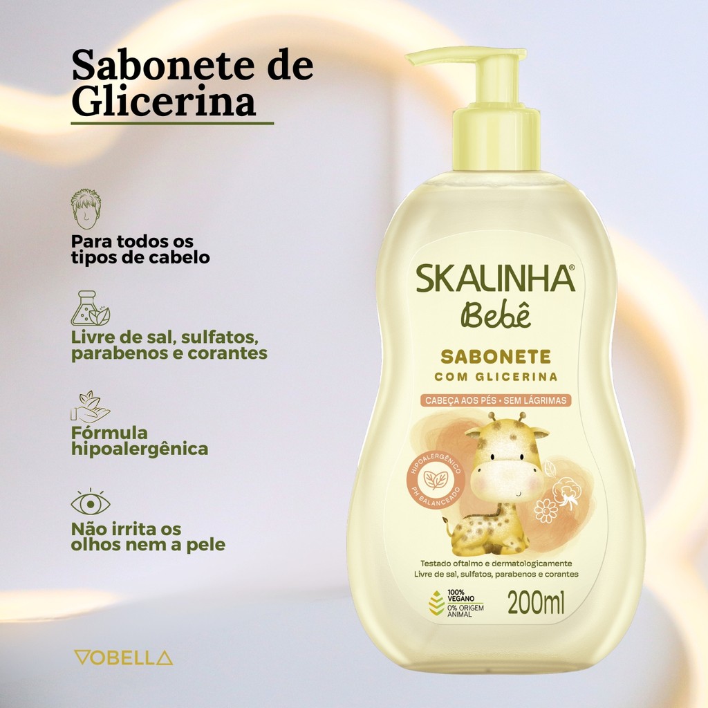 Oii, é um prazer ter você aqui! Quer garantir o cuidado mais suave e natural para o seu bebê? O Kit 2 Sabonete Líquido Bebê Infantil Lavanda Vegano Skalinha é a escolha perfeita para mamães que buscam produtos de qualidade, veganos e com fragrância delicada. Confira os motivos que tornam este kit essencial para o banho do seu pequeno: O que ele é: - 1 Kit 2 sabonete líquido bebê infantil lavanda. - Marca: Skala. - Livre de Parabenos. - Não testado em animais. - Fragrância: Lavanda. - Vegano. - Sem álcool. O que ele tem: - 2 Sabonetes líquido 200ml. - Glicerina. O que ele faz: - Limpeza suave do corpo e couro cabeludo. - Não irrita os olhos. Onde usar: - Cabeça aos pés. Como usar: - Durante o banho, aplique diretamente no corpo e, se desejar também no couro cabeludo. -Enxágue bem. Precauções de uso: - Evitar contato com olhos e mucosas. Caso isso ocorra, enxaguar abundantemente com água. - Não utilizar sobre a pele irritada ou lesionada. Em caso de irritação, suspender o uso e procurar orientação médica. - Conservar em local fresco, ao abrigo da luz e calor excessivo. - Não ingerir. Com fórmula vegana, sem ingredientes de origem animal, e um aroma relaxante de lavanda, este kit proporciona cuidado e carinho a cada banho. Garanta agora o Kit 2 Sabonete Líquido Bebê Infantil Lavanda Vegano Skalinha e ofereça ao seu bebê o que há de melhor! Surgiu alguma dúvida? Entre em contato com a gente! Boas Compras :)