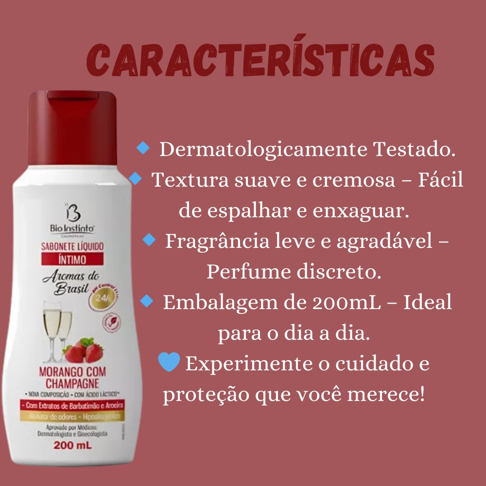 Sabonete Íntimo Bio Instinto Morango com Champanhe 200ML – Sedução e Frescor Uma combinação irresistível de morango e champanhe para um cuidado íntimo sofisticado e envolvente. Equilibra o pH e combate odores Fragrância sofisticada e marcante Sensação prolongada de frescor Por que comprar na nossa loja? Envio rápido e seguro Embalagem discreta para sua privacidade Produtos originais e de alta qualidade
