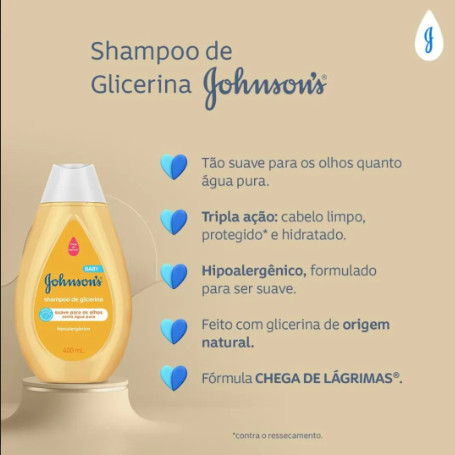 Esse kit contém 2 unidades de Shampoo Johnson's Baby de Glicerina Regular 400MLCom fórmula ainda mais suave para dar o cuidado que o cabelo do seu bebê precisa, o Shampoo JOHNSON’S® de Glicerina limpa suavemente e protege os cabelos e o couro cabeludo do bebê. Testado por pediatras e Dermatologistas. Frasco com 20% de plástico reciclado*, cuidando do seu bebê e do futuro do nosso planeta.A fórmula CHEGA DE LÁGRIMAS® permite uma experiência sem choro e é tão suave nos olhos quanto a água pura.Feito com glicerina de origem natural.Hipoalergênico, formulado para ser suave.Livre de corantes, parabenos e sulfatos.pH fisiológico.Testado por dermatologistas.Sobre esse produto:Desenvolvido com glicerina vegetalDeve ser aplicado por um adulto ou sob sua supervisão, massageando os cabelos molhados do bebêNão usar se o couro cabeludo estiver ferido ou irritadoDermatologicamente testado e hipoalergênicoTem pH fisiológico, é hipoalergênico e livre de corantes, parabenos, sulfatos e ftalatos