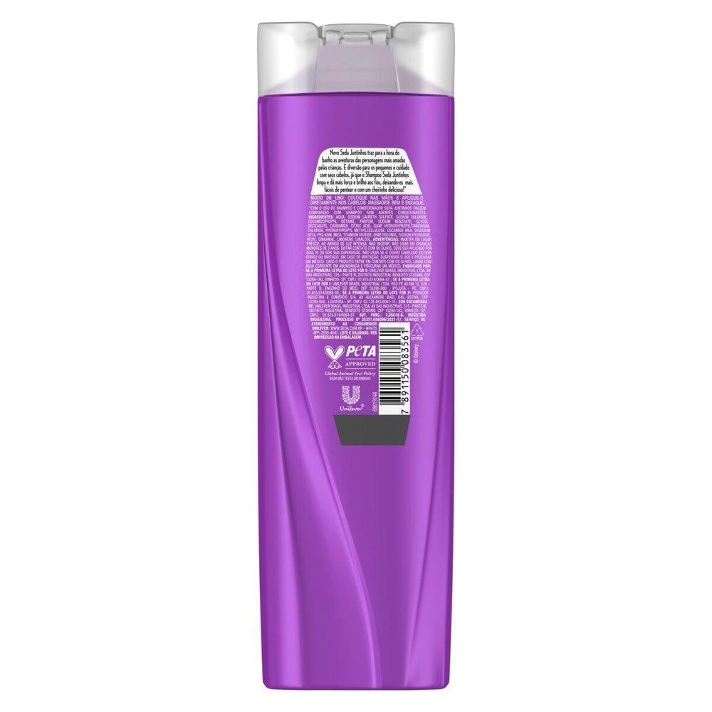 O Kit contém 2 Shampoos Seda Infantil Frozen Juntinhos Brilho Encantado com 300ml cada. Shampoo Congelado Brilho Encantado. Força e briho para todos os tipos de cabelo. O Shampoo Seda Juntinhos limpa e dá mais força e brilho aos fios, deixando-os mais fáceis de pentear e com um cheirinho delicioso! Seda não testa em animais. Com o uso do shampoo e condicionador Seda Juntinhos Frozen em comparação com shampoo sem agentes condicionantes nclusão de pelo menos 39 de plástico reciclado. Nossa garrafa é feita com plástico reciclado e é 100 reciclável Novo Seda Juntinhos traz para a hora do banho as aventuras das personagens mais amadas pelas crianças. É diversão para os pequenos e cuidado com seus cabelos, já que o Shampoo Seda Juntinhos limpa e dá mais força e brilho aos fios, deixando-os mais fáceis de pentear e com um cheirinho delicioso Como usar Coloque nas mãos e aplique-o diretamente nos cabelos. Massageie bem e enxágue. Quer resultados ainda mais incríveis Use também o Condicionador Seda Juntinhos Frozen.