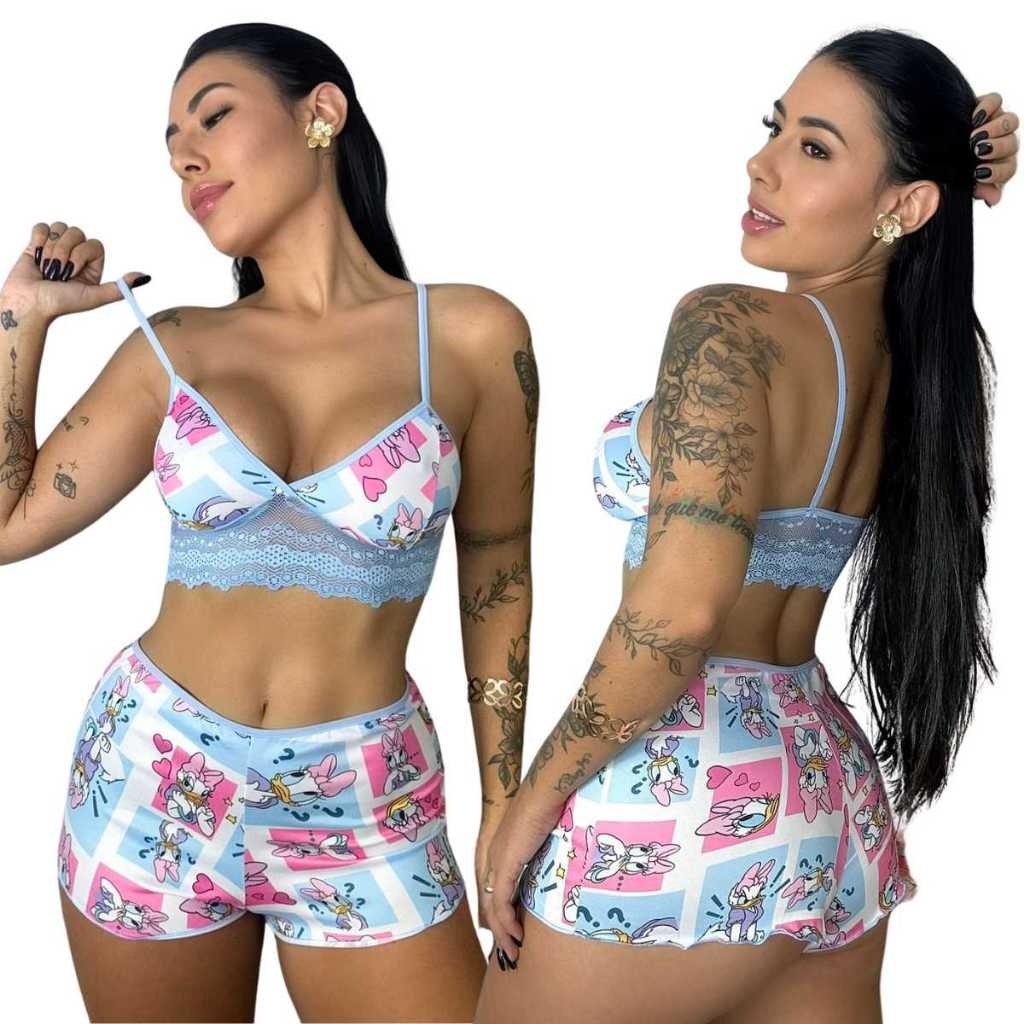 Kit 2 Short Doll Curto Pijama de Dormir Estampado Feminino Personagem com Alça