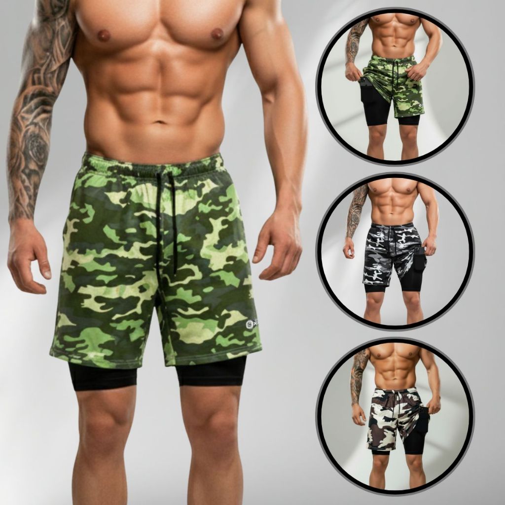 KIT 2 Shorts 2 Em 1 Bermuda Camuflada Compressão Masculino Dry Fit Academia Treino