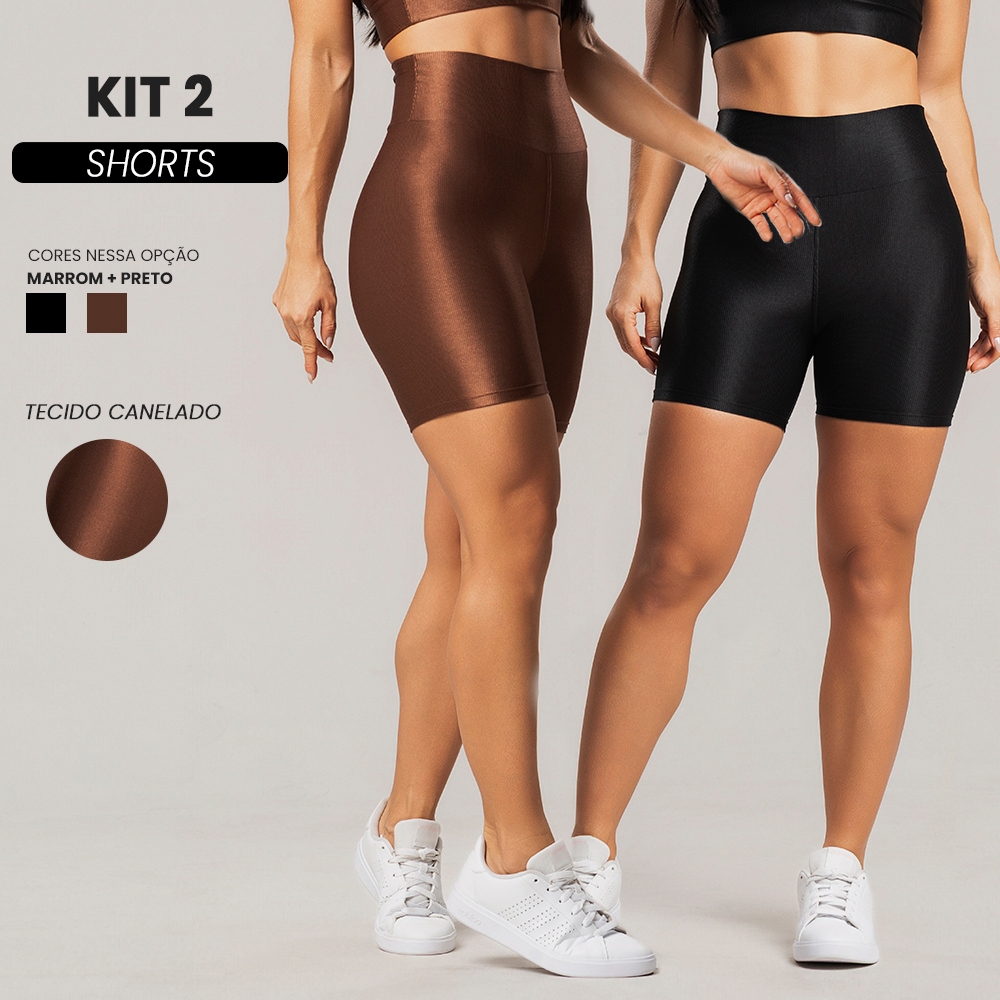 Kit 2 Shorts fitness feminino canelado brilhoso cós alto academia