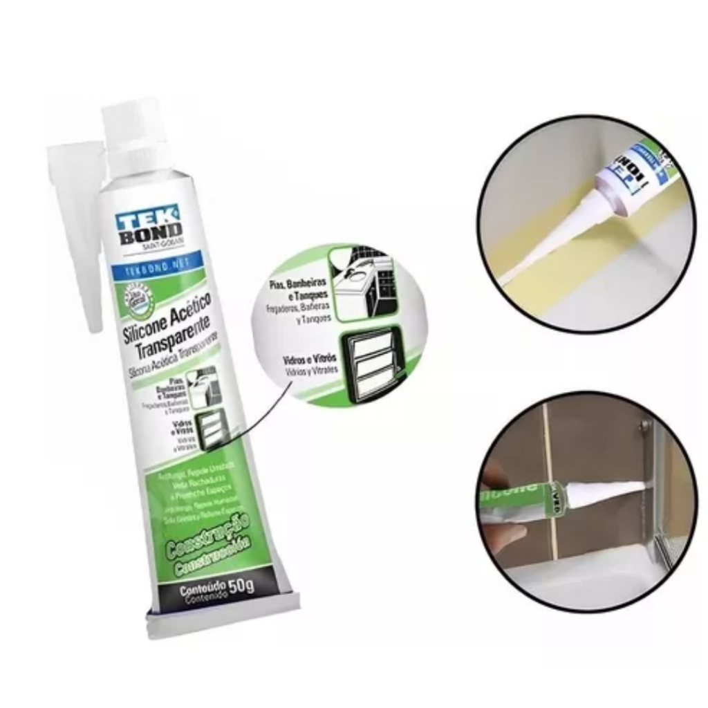 KIT 2 ADESIVOS DE SILICONE ACÉTICO CONSTRUÇÃO USO GERAL 50G TRANSPARENTE TEKBOND O SILICONE ACÉTICO TRANSPARENTE CONSTRUÇÃO é um adesivo selante tixotrópico monocomponente, baixo módulo, anti-fungo e de cura acética. Sua cura ocorre em temperatura ambiente e na exposição à umidade do ar. É considerado um silicone de uso geral, muito utilizado na construção civil na vedação e selagem de pias e vasos sanitários, box em banheiros, portas e janelas. Possui excelente resistência aos raios UV e pode ser aplicado em áreas externas. CONTEÚDO DA EMBALAGEM: - Kit 2 adesivos de silicone acético construção transparente uso geral 50g ESPECIFICAÇÕES TÉCNICAS: - tipo: adesivo de silicone acético construção uso geral - Aparência ( visual ): Pasta translúcida com odor característico ( ácido acético ) - Densidade a 25 ºC ( g/mL ): 0,93 à 1,05 - Tempo de formação de película: 5 à 15 minutos - Temperatura ideal de aplicação: + 5 à 35°C - Temperatura de trabalho: - 50 à 150°C - Alongamento à ruptura: 800 % - Dureza Shore A: 25 - Cura gradativa a 23°C e 55% U.R. após 24 horas: 3 mm APLICAÇÕES: - É considerado um silicone de uso geral, muito utilizado na construção civil na vedação e selagem de pias e vasos sanitários, box em banheiros, portas e janelas. Possui excelente resistência aos raios UV e pode ser aplicado em áreas externas. CARACTERÍSTICAS: - O Silicone Acético Transparente Construcão é um adesivo selante tixotrópico monocomponente, baixo módulo, antifungo e de cura acética. Sua cura ocorre em temperatura ambiente e na exposição à umidade do ar. MODO DE USAR: 1- As superfícies de aplicação devem ser limpas com álcool ou acetona, secas e firmes. Não utilizar querosene ou gasolina para a limpeza das superfícies. 2- Aplicar fita crepe para proteger as áreas onde não se deseja aplicar o silicone. 3- Cortar a ponta do cartucho e do bico aplicador em um ângulo de 45º no tamanho e espessura desejada. 4- Aplicar o silicone na área desejada e fazer o acabamento. ARMAZENAMENTO: - Mantenha o produto em recipiente fechado e estocado em local fresco à temperatura de 5 à 27ºC, ao abrigo da luz solar direta, longe de calor excessivo, faíscas, chamas. Fora do alcance de crianças e animais domésticos. Para evitar a contaminação do produto não utilizado, não retorne qualquer sobra de material em sua embalagem original.- Silicone de vedação para banheiro, vaso, pia, cuba, janela, vidro, frestas, buracos, tanque, rachaduras e etc