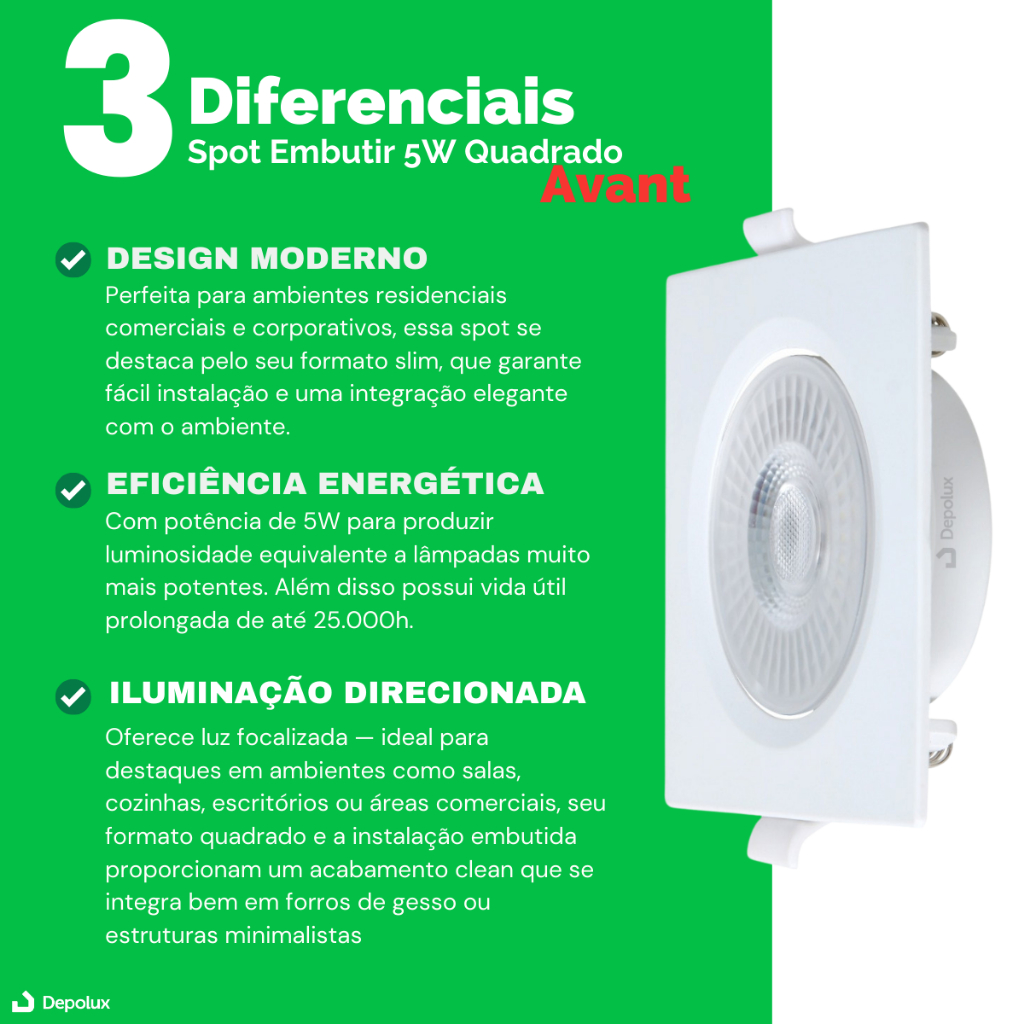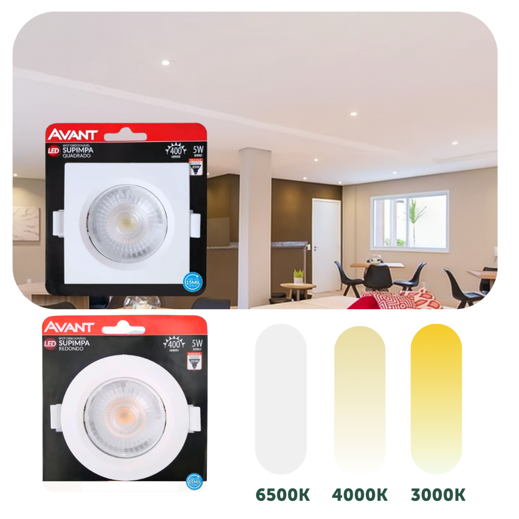Kit 2 Luminária Teto Embutir Embutir Led 5W Quadrado Dicroica Direcionável Móvel Avant Principais BENEFÍCIOS de comprar este produto: - LED de alto brilho - Excelente fluxo luminoso e vida - Acabamento não amarela - Resistente a maresia e corrosão - Furação padrão do gesso/forro/móvel Transforme seu ambiente com spot 5w Quadrado da Avant Iluminação! O spot é ideal para quem busca uma iluminação moderna e eficiente. Com um design quadrado e móvel, os spots são perfeitos para instalação em gessos, forros de PVC, madeira, lajes recortadas e móveis, permitindo que você use sua criatividade para criar ambientes únicos e aconchegantes. Os spots LED Avant oferecem um LED de alto brilho, garantindo excelente fluxo luminoso e longa vida útil. Com resistência a maresia e corrosão, e acabamento que não amarela, são ideais para qualquer ambiente interno. Além disso, a tecnologia LED integrada proporciona economia de energia, tornando-os uma escolha sustentável e econômica. ESPECIFICAÇÕES TÉCNICAS: - Marca: Avant - Potência: 5 W - Dimensões AxLxP: 9 x 9 x 2,8 cm -Nicho recorte: 7cm x 7cm - Cor da Luz: 6500K Frio - 4000K Neutro - 3000K Quente (escolher no anúncio) - Direção da luz: Direcionável - Materiais: Policarbonato - Lugares de montagem: Teto - Ambientes: Interno/Externo Abrigado - Tipo de alimentação: 110/220v - Vida Útil: 25.000 horas - Fluxo Luminoso: 400 Lumens - Eficiência Luminosa: 80 Lm/W - Ângulo de Abertura: 38° - Formato: Quadrado - Cor Acabamento: Branco Fosco ITENS INCLUSOS: - 2 Spot LED Completo 5W Quadrado GARANTIA: O produto possui garantia de 1 ano junto ao fabricante. Para mais informações sobre a cobertura e como acionar a garantia, consulte o manual do produto ou entre em contato com o fabricante. INSTRUÇÕES DE USO: 1. Verifique se a voltagem do local é compatível com o produto. 2. Faça o recorte no gesso ou forro conforme as dimensões especificadas. 3. Conecte os fios do spot à rede elétrica. 4. Encaixe o spot no recorte e fixe com as presilhas inclusas. 5. Ligue o interruptor e aproveite a nova iluminação! Compre agora e transforme seu ambiente com a qualidade e eficiência dos spots LED AVANT!