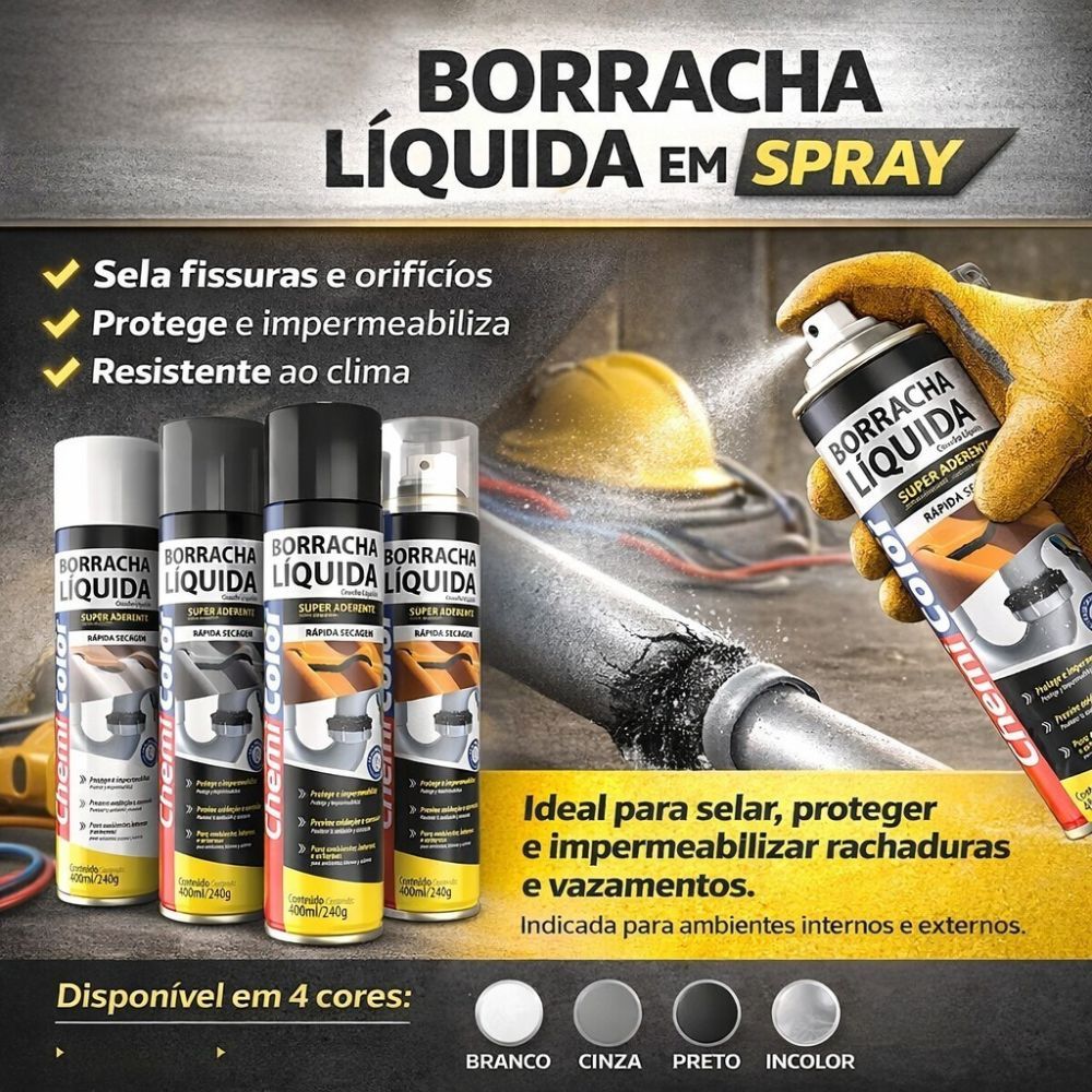 BORRACHA LÍQUIDA CHEMICOLOR 400ML 240G SPRAY IMPERMEABILIZANTE FLEXÍVEL PARA VEDAÇÃO SOBRE O PRODUTO A Borracha Líquida Chemicolor é um revestimento impermeabilizante em spray desenvolvido para vedar, proteger e isolar superfícies contra umidade e infiltrações. Forma uma película flexível, resistente e durável após a secagem, adaptando-se a diferentes aplicações. CARACTERÍSTICAS • Marca: Chemicolor • Produto: Borracha Líquida Spray • Volume: 400ml ou 240g • Aplicação: Aerossol • Película flexível e impermeável • Alta aderência • Secagem rápida • Uso profissional e doméstico • Produto pronto para uso BENEFÍCIOS • Veda trincas, frestas e pequenas fissuras • Protege contra água e umidade • Mantém flexibilidade após a secagem • Fácil aplicação em spray • Excelente durabilidade • Reduz infiltrações e vazamentos INDICADO PARA/APLICAÇÃO/COMPATIBILIDADE • Calhas e rufos • Telhados e coberturas • Superfícies metálicas e plásticas • Uso automotivo e residencial • Reparos e manutenções em geral INSTALAÇÃO/COMO USAR 1. Agite bem a embalagem antes de usar. 2. Limpe e seque a superfície. 3. Aplique o produto a uma distância adequada. 4. Aguarde a secagem entre demãos. 5. Reaplique se necessário para melhor vedação. CUIDADOS • Produto inflamável. • Utilizar em ambiente ventilado. • Evitar contato com olhos e pele. • Não aplicar sobre superfícies aquecidas. • Manter fora do alcance de crianças. GARANTIA Garantia: Com garantia contra defeitos de fabricação conforme legislação vigente. OBSERVAÇÕES • Produto novo • Imagens ilustrativas • Leia atentamente o rótulo antes do uso