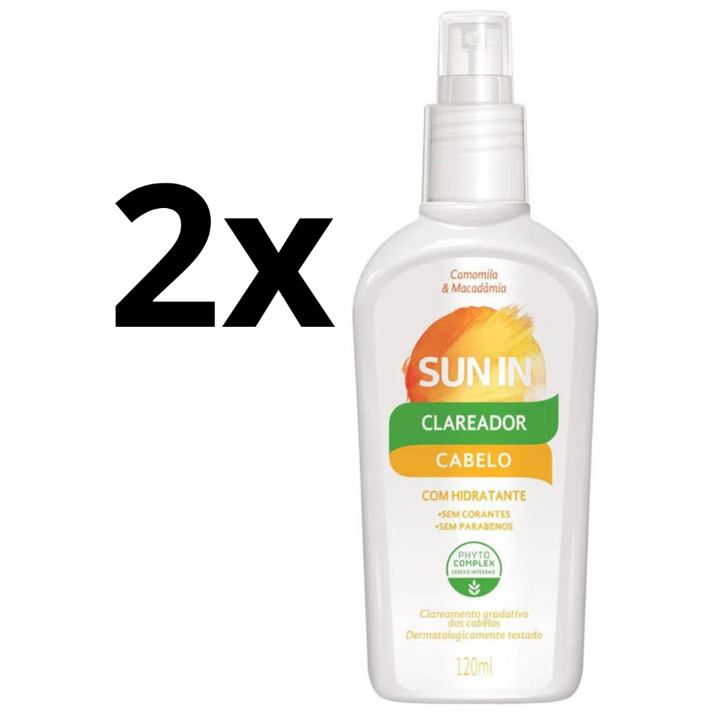 2 Unidades com 120ml cada unidade. O Clareador e Hidratante Capilar Sun In Phytoervas 120ml é um clareador capilar e hidratante capilar, que proporciona reflexos de luz e clareamento dos fios. A intensidade do clareamento é gradativa e varia de acordo com a tonalidade natural dos cabelos. O Sun In tem ação condicionadora, é enriquecido com extrato de camomila e óleo de Macadâmia que ajuda a proteger os fios enquanto clareia. Sua nova fórmula é mais potente e de fácil aplicação com spray. Sun in cabelo é um clareador de cabelos com ação rápida e embalagem prática que facilita o uso. Proporciona reflexos de luz e clareamento dos fios gradativamente. A intensidade do clareamento varia de acordo com a tonalidade natural dos cabelos e da quantidade de aplicações, com resultado gradual: quanto mais aplicações, mais intenso é o clareamento. Tem ação condicionadora enriquecida com extrato de camomila e óleo de macadâmia, que ajuda a proteger os fios enquanto clareia. • Fórmula livre de ingredientes de origem animal. • Produto não testado em animais. Modo de usar: aplique sun in cabelo nos cabelos e deixe agir por 20 minutos. Para um resultado mais eficiente, após a aplicação, utilize um secador de cabelos com temperatura média a alta para ativar o clareamento. Verifique se o tom está conforme o desejado – caso contrário, repita a operação. Após terminar o processo, lave bem os cabelos. Você pode usar sun in cabelo mais vezes caso queira que fiquem mais claros. Cuidado: contém substâncias passíveis de causar irritação na pele de determinadas pessoas. Antes de usar, faça a prova de toque. Pode causar reação alérgica. Prova de toque: aplique uma pequena quantidade do produto no antebraço. Lave o local após 20 minutos. Depois de 24 horas, se houver irritação, coceira ou ardência no local, o produto não deve ser usado. Precauções: não usar em crianças. Impróprio para gestantes. Contém peróxido de hidrogênio. Evite contato com os olhos. Caso ocorra, enxágue com água em abundância. Não usar nos cílios ou sobrancelhas. A aplicação direta pode causar irritação nos olhos ou cegueira. Não aplique o produto na pele ou no couro cabeludo se estiverem feridos ou lesionados. Mantenha fora do alcance das crianças. Respeite o tempo de contato do produto com a pele. Em seguida, lave a região abundantemente com água. Em caso de irritação da pele, lave-a abundantemente com água e evite exposição ao sol. Usar luvas adequadas (não inclusas). Não exponha a embalagem/produto ao sol. Não fazer a aplicação do produto e ficar exposto ao sol simultaneamente.