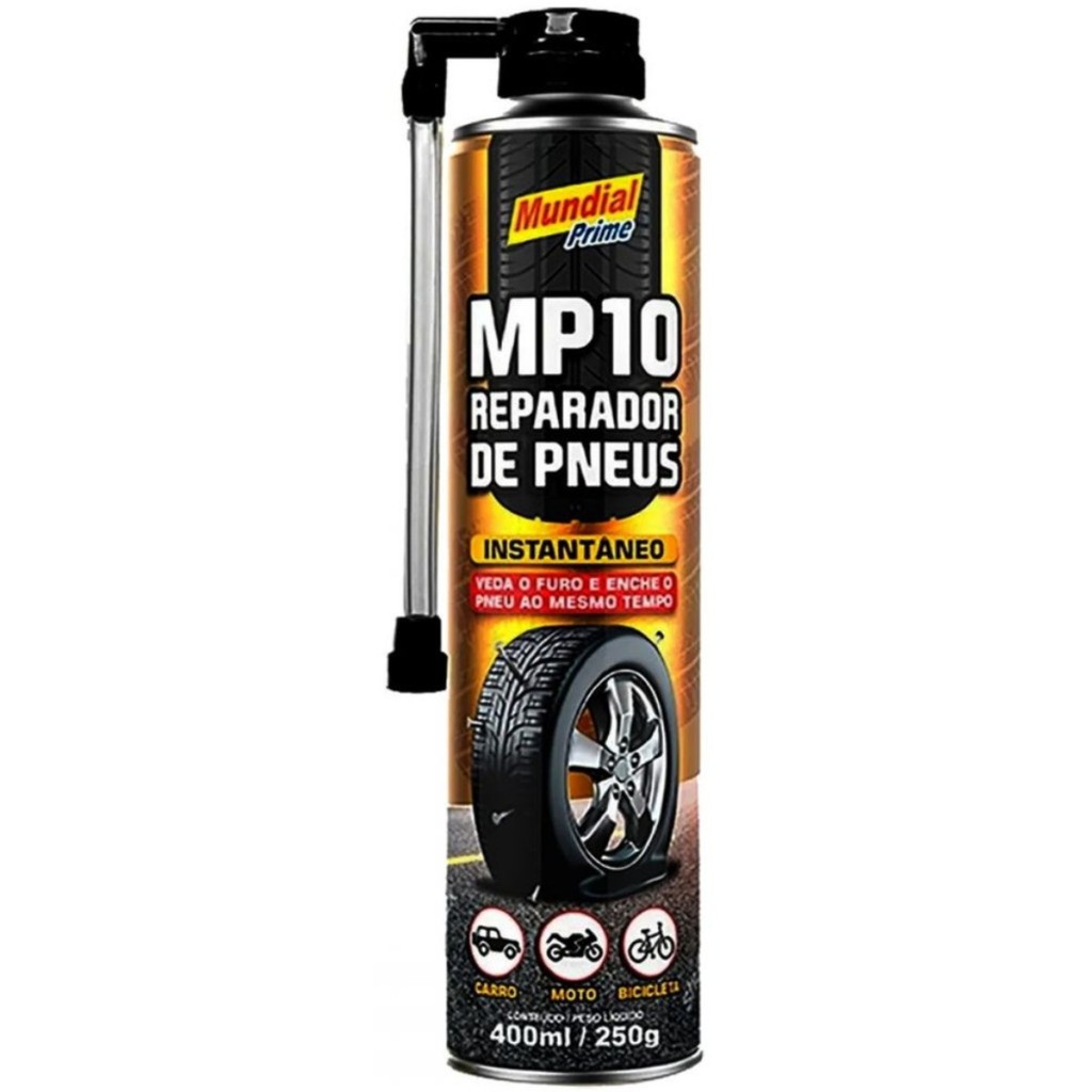 KIT 02 REPARADORES DE PNEUS INSTANTÂNEO MP10 MUNDIAL PRIME 400ML É um reparador de pneus instantâneo, que auxilia no reparo de pequenos furos e no enchimento do pneu em situações de emergência, no que se refere a pneu furado ou vazio em rodovias ou estradas que podem colocar em risco a segurança e conforto do condutor. - INDICADO PARA CARROS, MOTOS E BICICLETAS. - USE EM EMERGÊNCIA. - EVITA A TROCA. - PNEU COM CAMARA OU SEM CAMARA. - INSTANTÂNEO. - VEDA O FURO E ENCHE O PNEU AO MESMO TEMPO. Modo de Utilização• 1 - Agite bem antes de usar. Remova a capa protetora e rosqueie a ponta do aplicador na válvula do pneu. A lata deve ser utilizada sempre na posição vertical. Este produto pode não ter seu desempenho ideal em caso de rasgos nos pneus ou furos de grande dimensão, ou mesmo pneus que estejam em mau estado de conservação ou danificados. 2 - Acione a válvula do produto, pressionando-a de forma que o conteúdo se transfira para o pneu, agitando a lata de vez em quando. Continue até que este aparente estar cheio. Desrosqueie a ponta do aplicador e tampe a válvula do pneu rapidamente. Para pneus com câmara, recomenda-se puxar a válvula do pneu para evitar que o produto escape antes que a câmara fique totalmente cheia.• 3 - Imediatamente, coloque o veículo em movimento, em velocidade baixa, de forma que o produto se espalhe uniformemente pelo interior do pneu. Evite dirigir em alta velocidade ou realizar manobras bruscas. Dirija-se imediatamente ao posto ou mecânico mais próximo a fim de realizar o conserto definitivo do pneu. Importante: Avise o profissional que este produto foi utilizado e advirta-o para não produzir ou evitar realizar o trabalho em locais onde possa haver faíscas ou fogo durante o concerto