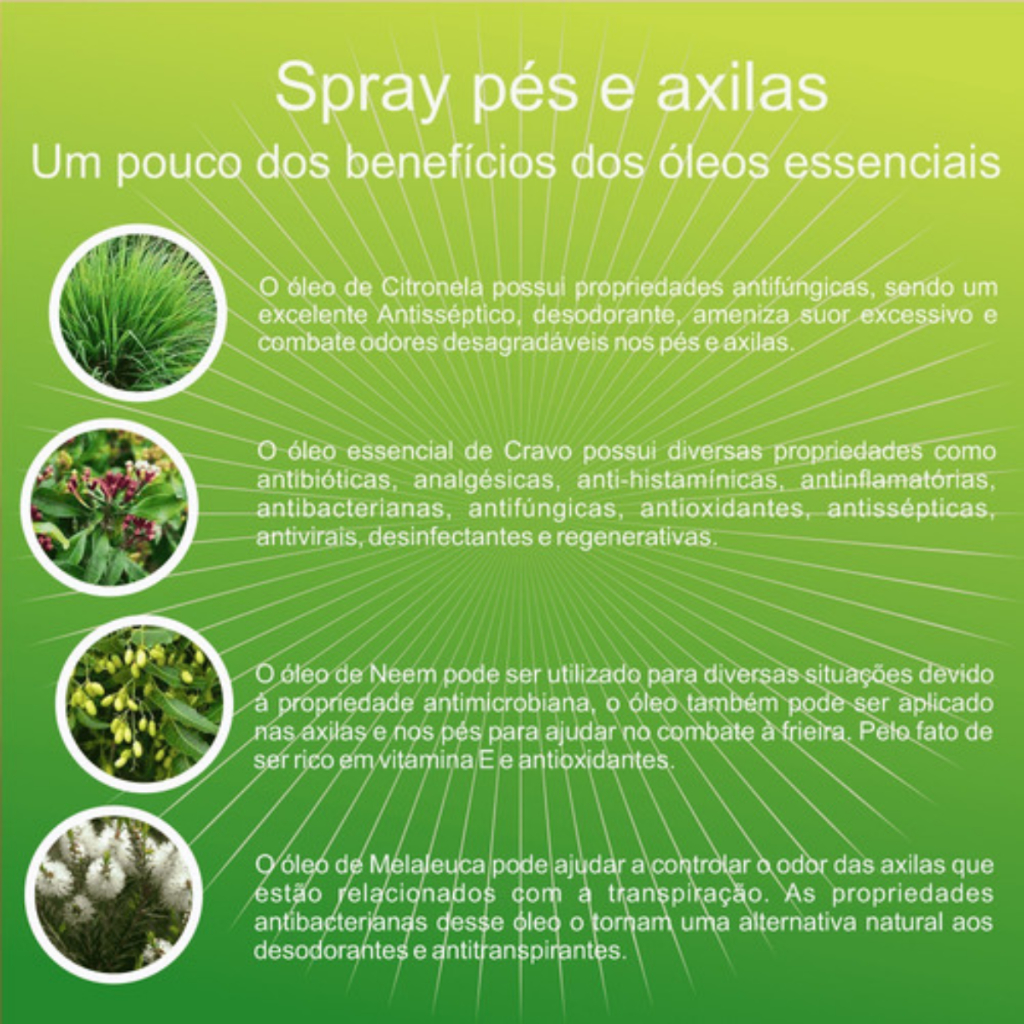 O Kit C/2 Sprays de Melaleuca para os Pés e Axilas (100ml cada), foi desenvolvido com óleos essenciais de Melaleuca, Citronela e Alecrim, uma combinação poderosa contra o mau odor nos pés e axilas. Resultados surpeendentes na neutralização dos odores em relação aos produtos existentes no mercado. Aplique diariamente nas axilas e entre os dedos, palma e dorso dos pés, antes de calçar o tênis ou sapatos, não necessita esperar a secagem. Agite sempre antes de usar.