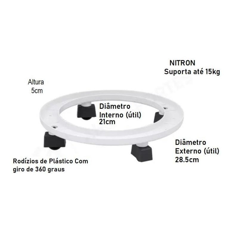 Suporte Para Botijão gas e vaso flores e galão agua 4 rodas plastico Nitron Capacidade 15KG Branco Fácil locomoção, pois o suporte é composto por rodinha, evitando que você pegue peso desnecessário. Suporte giratório para botijão de gás com rodinhas reforçadas. Suporte multiuso giratório resistente ideal para armazenar e transportar objetos pesados como o botijão de gás para cozinha, vasos, lixeiras plásticas e galão de água. Suas rodinhas evitam esforços desnecessários e o contato direto com o chão facilitando a limpeza do local e preservando o objeto diminuindo a umidade. Utensílio extremamente útil para sua casa, armazene e transporte seus objetos sem ruídos ou riscos em seu piso. O suporte é feito em plástico super reforçado PP ( polipropileno), vem com 4 rodinhas de plástico, que fazem com que ele deslize sobre as superfícies. Cor: Branco. Contém. 1 unidade. Medida: 28,5x5x28,5cm. Material: Plástico. Capacidade: Suporta até 15kg.