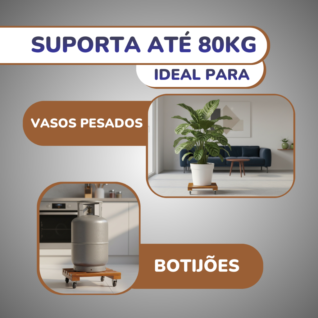 Kit 2 Suportes Quadrado Madeira Com Rodinhas Para Botijão Ou Vaso De Planta 30CM Suporta Até 80 kg Organize e facilite o deslocamento dos seus vasos de planta ou botijões com este suporte quadrado de madeira com rodinhas, resistente e funcional. Perfeito para uso em áreas internas ou externas, ele suporta até 80 kg, proporcionando segurança e praticidade no dia a dia. Características Principais - Material de Qualidade: Base em madeira resistente, ideal para sustentar vasos pesados ou botijões. - Rodinhas Reforçadas: Permitem movimentar o vaso ou botijão com facilidade, evitando esforço físico e arranhões no piso. - Formato Quadrado : Design versátil que combina com diferentes estilos de decoração. - Multiuso: Pode ser usado para vasos de plantas, galões de água, botijões de gás ou outros objetos pesados. Especificações Técnicas Material: Madeira com rodízios plásticos Formato: Redondo Tamanhos: 20 cm / 25 cm / 30 cm Capacidade de Carga: Até 80 kg