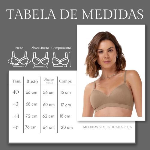 DETALHES DO PRODUTO: - Sutiã com Bojo - Sem Aro - Sem Costura - Alças Reguláveis - Alças Ajustáveis nas costas TABELA DE MEDIDAS: (Medidas sem esticar / Medidas em circunferência) P (40): Busto: 66 cm / Cintura: 56 cm / Altura: 16 cm M (42): Busto: 68 cm /Cintura: 60 cm / Altura: 17 cm G (44): Busto: 72 cm / Cintura: 62 cm / Altura: 18 cm GG (46): Busto: 76 cm / Cintura: 64 cm / Altura: 20 cm COMPOSIÇÃO: 89% Poliamida e 11% Elastano - Sutiã comfort Zee Rucci confeccionado microfibra, com tecnologia seamless (sem costura). - Essa tecnologia produz as peças inteiras em teares, reduzindo o descarte têxtil. - Este sutiã apresenta modelagem triangular no busto, ideal para usar com blusas, camisas ou vestidos com decote amplo. - Possui bojo macio interno e sem aros, proporcionando conforto maior durabilidade e evita marcar o corpo durante o uso. - Com alças finas e reguláveis trazendo delicadeza. INSTRUÇÕES PARA AUMENTAR A DURABILIDADE DA PEÇA: - Lavagem apenas manual, com sabão neutro. - Não alvejar, não esfregue e não torça. - Secagem em varal, preferência à sombra. - Não recomendamos passar ferro! - Tenha cuidado com o uso de acessórios que danifiquem ou repuxem o fio. PERGUNTAS FREQUENTES: O produto vem igual ao da foto? R: Sim, garantimos que o produto será idêntico à imagem, com fotos tiradas com cuidado. Qual tamanho fica bom para mim? R: Consulte nossa tabela de medidas na descrição do produto ou nas imagens para escolher o tamanho adequado. Vocês enviam no mesmo dia? R: Sim, enviamos pedidos no mesmo dia se realizados antes do horário de corte; pedidos feitos depois serão enviados no próximo dia útil. ISABELA CONFECÇÕES - NOSSA FAMÍLIA VESTE A SUA! Somos uma empresa familiar com mais de 50 anos de tradição na confecção de roupas infantis e adultas no Paraná. Nosso compromisso é oferecer produtos de qualidade, acessíveis e atuais, sempre com foco na satisfação de nossos clientes. SKU: 243237